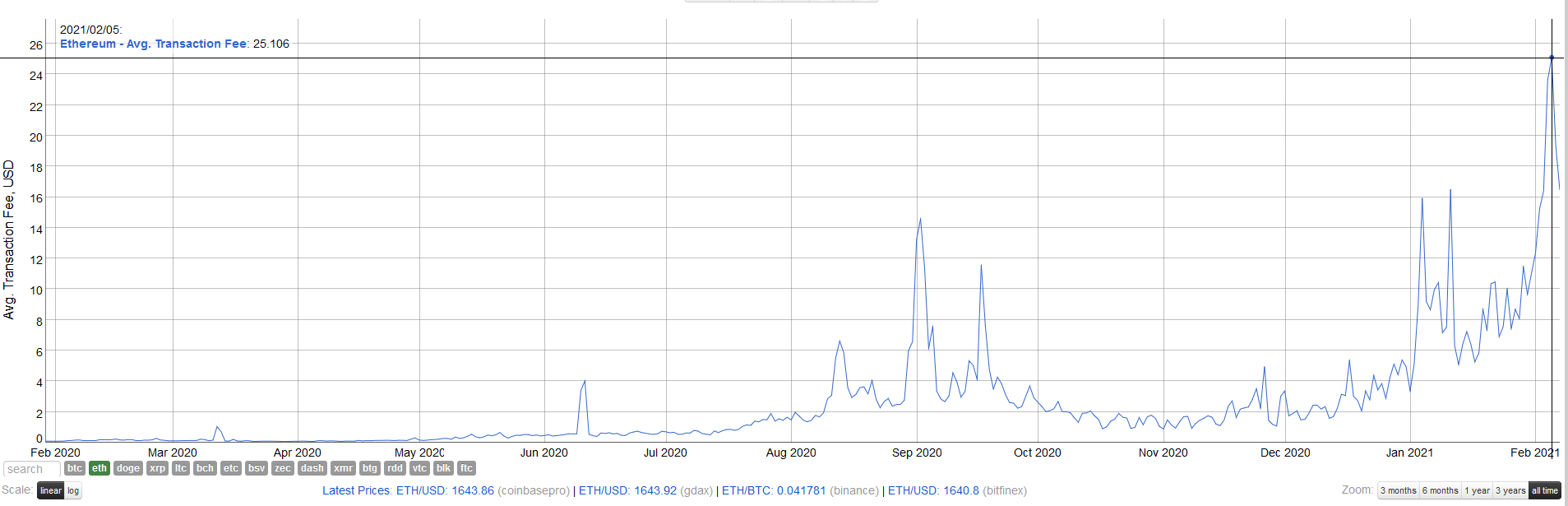 Les frais de transaction ont atteint un coût moyen de plus de 25 dollars cette journée-là : largement de quoi décourager les plus petites transactions !