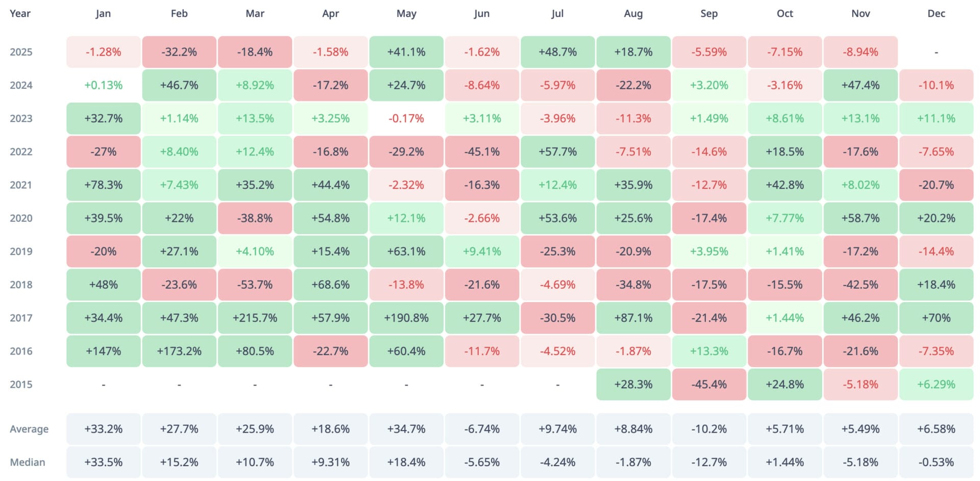 ETH a signé un ATH en août, mais depuis, les vendeurs ont clairement la main. En effet, le cours a perdu 5,6 % en septembre, puis il a chuté de plus de 7 % en octobre. Avec ces deux mois dans le rouge, ETH enregistre sept mois négatifs en 2025 :
