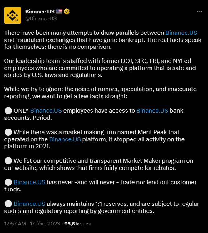La suite du message sera une réponse point par point aux accusations de Reuters. Pour commencer, Binance affirme que seuls les employés ont accès aux comptes en banque. Puis, elle reconnait que Merit Peak avait bien un compte sur Binance.us, mais que la société a arrêté ses activités en 2021. Ensuite, le message stipule que la politique vis-à-vis des Market Maker est transparente et concurrentielle. Enfin, Binance.us rappelle qu’elle n’a pas prêté ou échangé les fonds des clients et qu’elle ne le fera jamais. Finalement, le message se termine en disant que les réserves financières font l’objet de contrôles réguliers de la part des autorités et qu’elles couvrent les dépôts des clients.