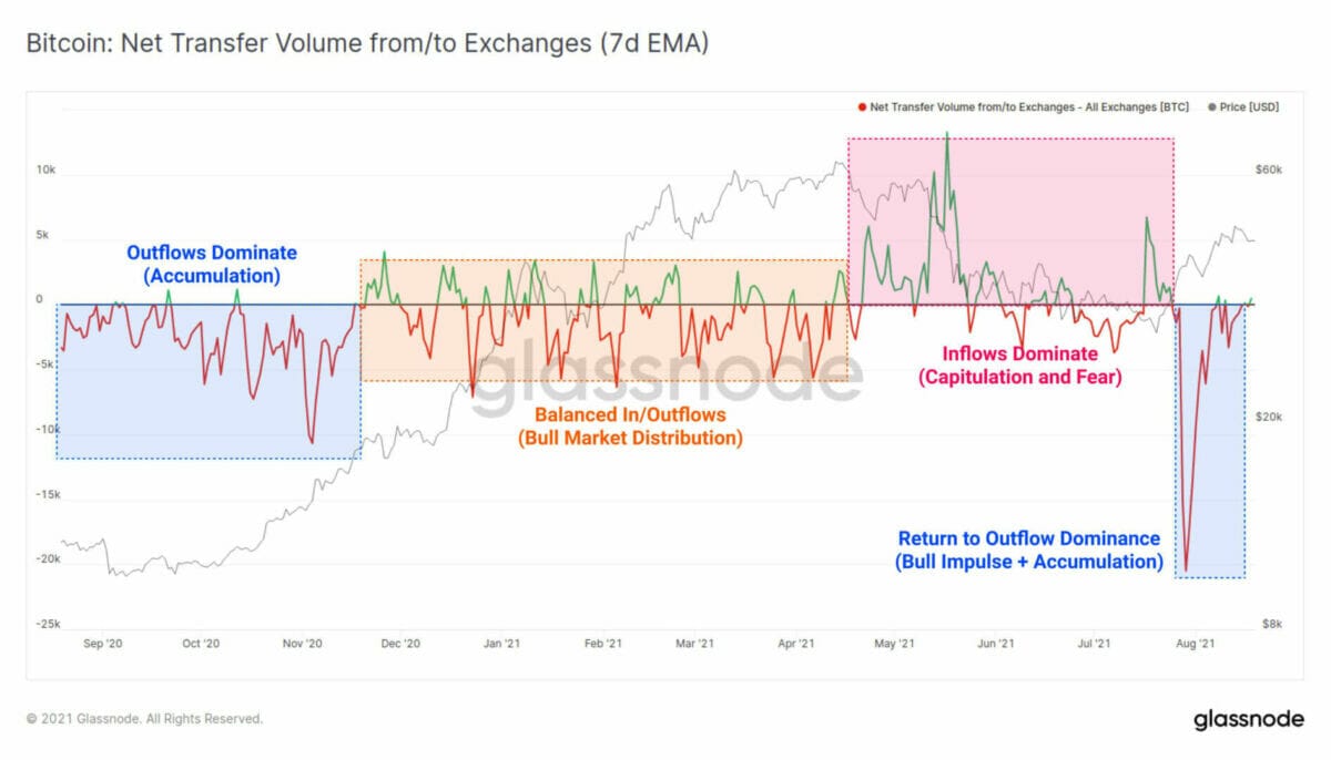 Comme on peut le voir sur le graphique ci-dessous de Glassnode, le marché du BTC est passé par plusieurs phases aux dominances différentes sur les flux d’échange.