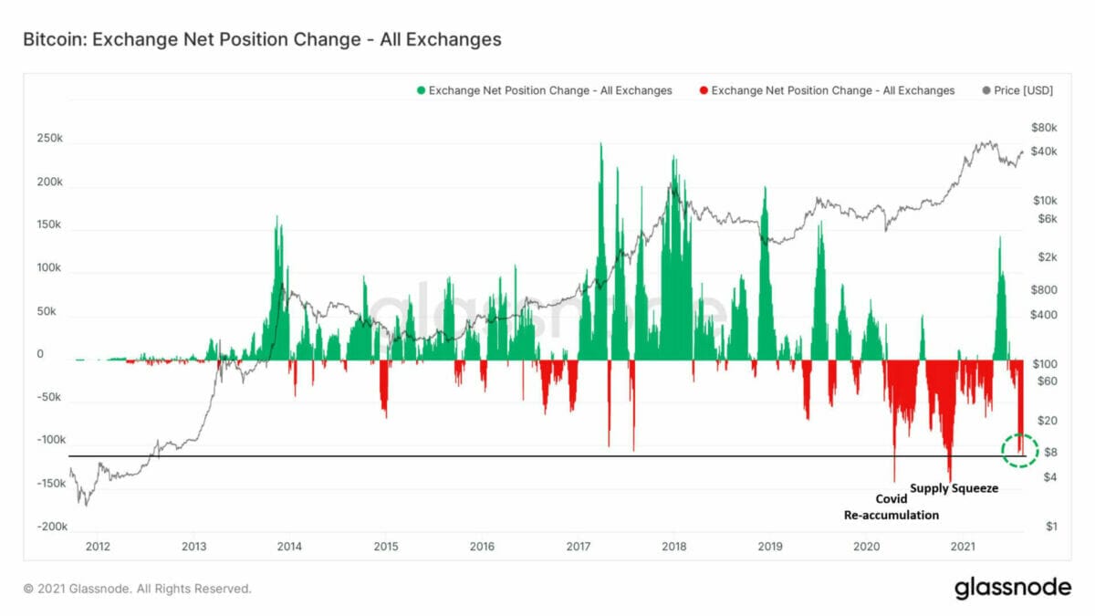 Avec la chute du cours de Bitcoin depuis mi-mai 2021, une phase de peur et de capitulation parmi les investisseurs a marqué un bref retour en masse de BTC sur les exchanges. À l’exact inverse, avec la récente reprise des prix du BTC au-dessus de 40 000 dollars, une nouvelle phase d’accumulation (et donc de retraits de bitcoins) semble avoir a été déclenchée par cette impulsion haussière.