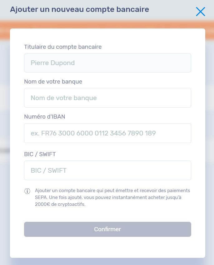 Autre possibilité : lier votre compte bancaire à votre compte Coinhouse. Après avoir cliqué sur « Lier un autre compte bancaire », vous pourrez rentrer les détails de votre compte bancaire (titulaire, nom de la banque, numéros IBAN et BIC/SWIFT).