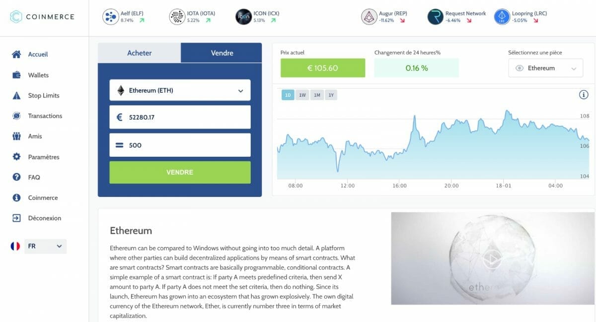 Chez Coinmerce.io, vous pouvez échanger des cryptomonnaies directement par le biais de l’application mobile dédiée. Cette application est disponible pour iOS (Apple) et Android, une version web est aussi disponible. C’est le premier courtier néerlandais qui offre une application mobile pour acheter des cryptomonnaies. Coinmerce offre avec l’application une solution tout-en-un pour gérer, acheter, vendre et stocker les cryptomonnaies. La société a rendu le processus si facile que vous n’avez besoin d’aucune connaissance en crypto ou en informatique pour pouvoir en acheter ou en revendre.