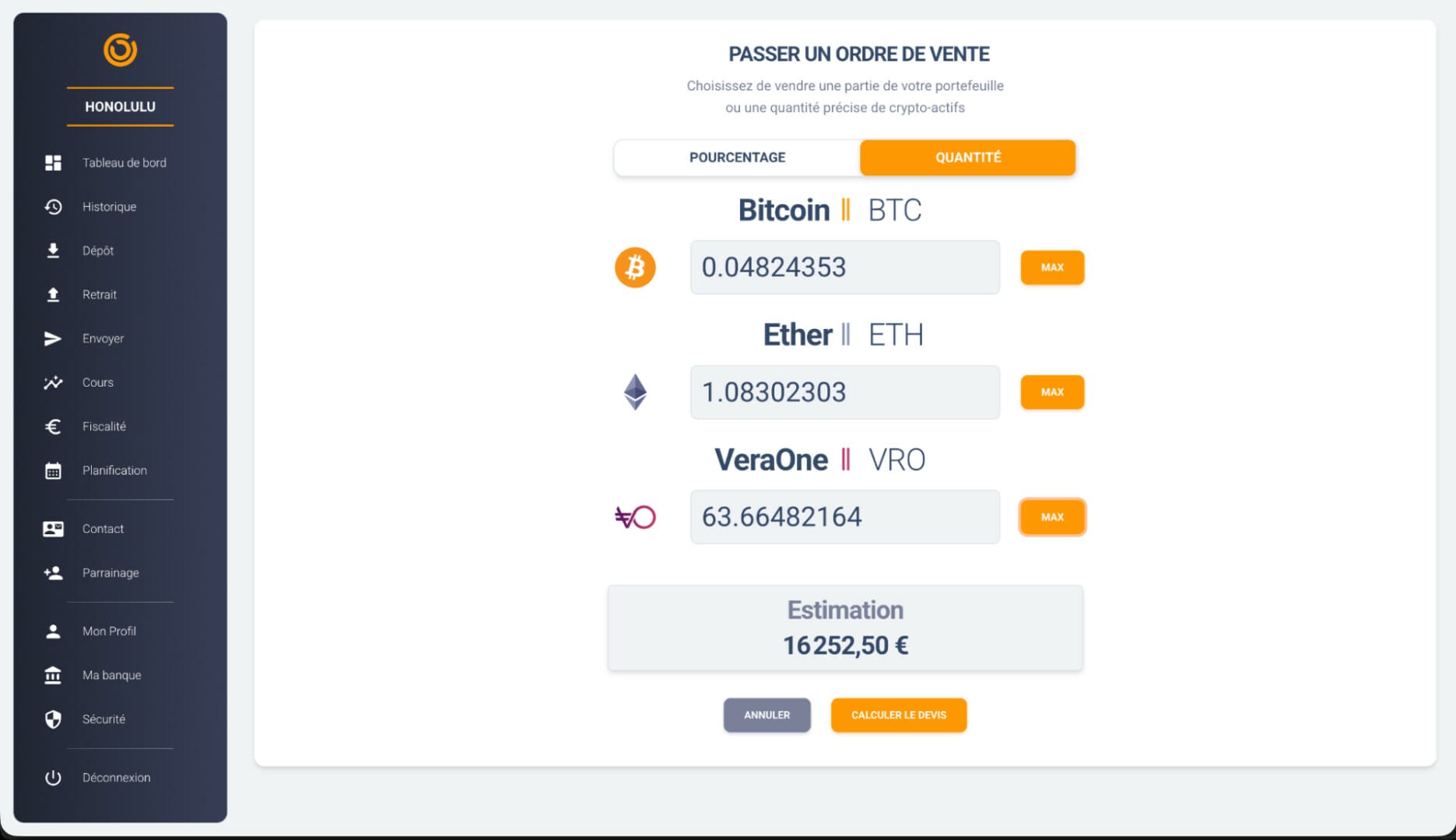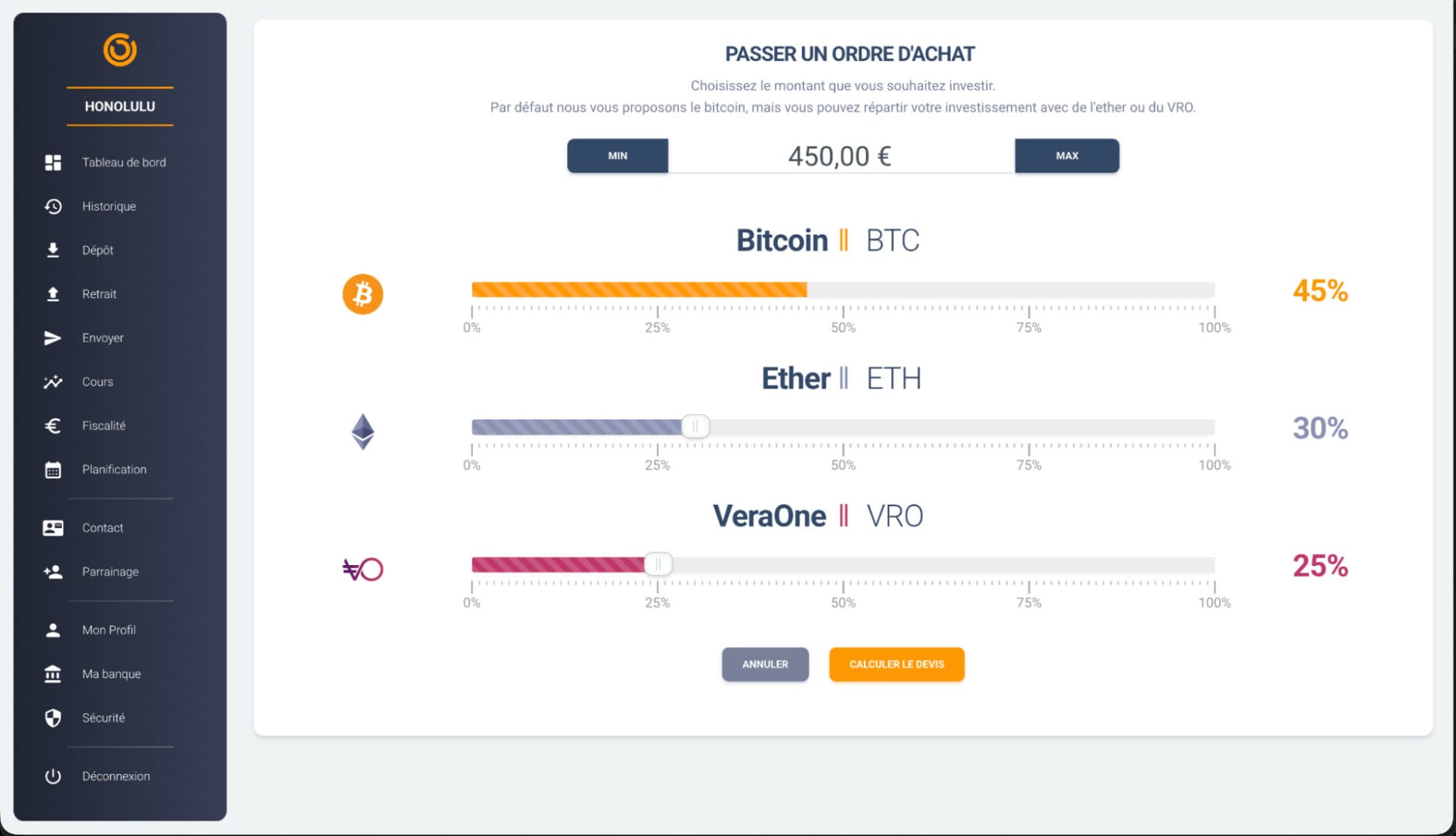 Chaque opération est guidée pas à pas, avec un design épuré et des curseurs intuitifs pour ajuster vos montants ou répartir vos actifs. Que vous souhaitiez convertir une partie de vos VeraOne en Bitcoin, vendre vos Ethers, ou planifier un investissement récurrent, tout se fait en quelques secondes :