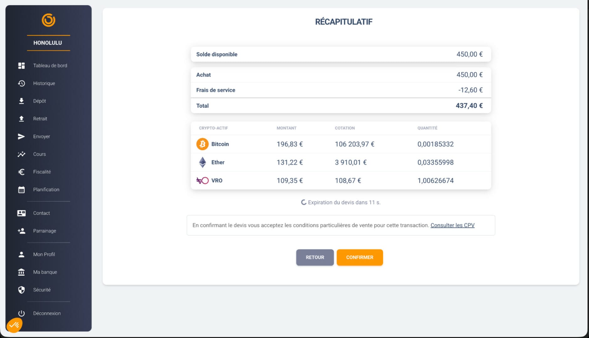 Il offre un choix volontairement très restreint de jetons. Vous y trouverez du bitcoin (BTC) de l’ethereum (ETH) et du VeraOne (VRO).