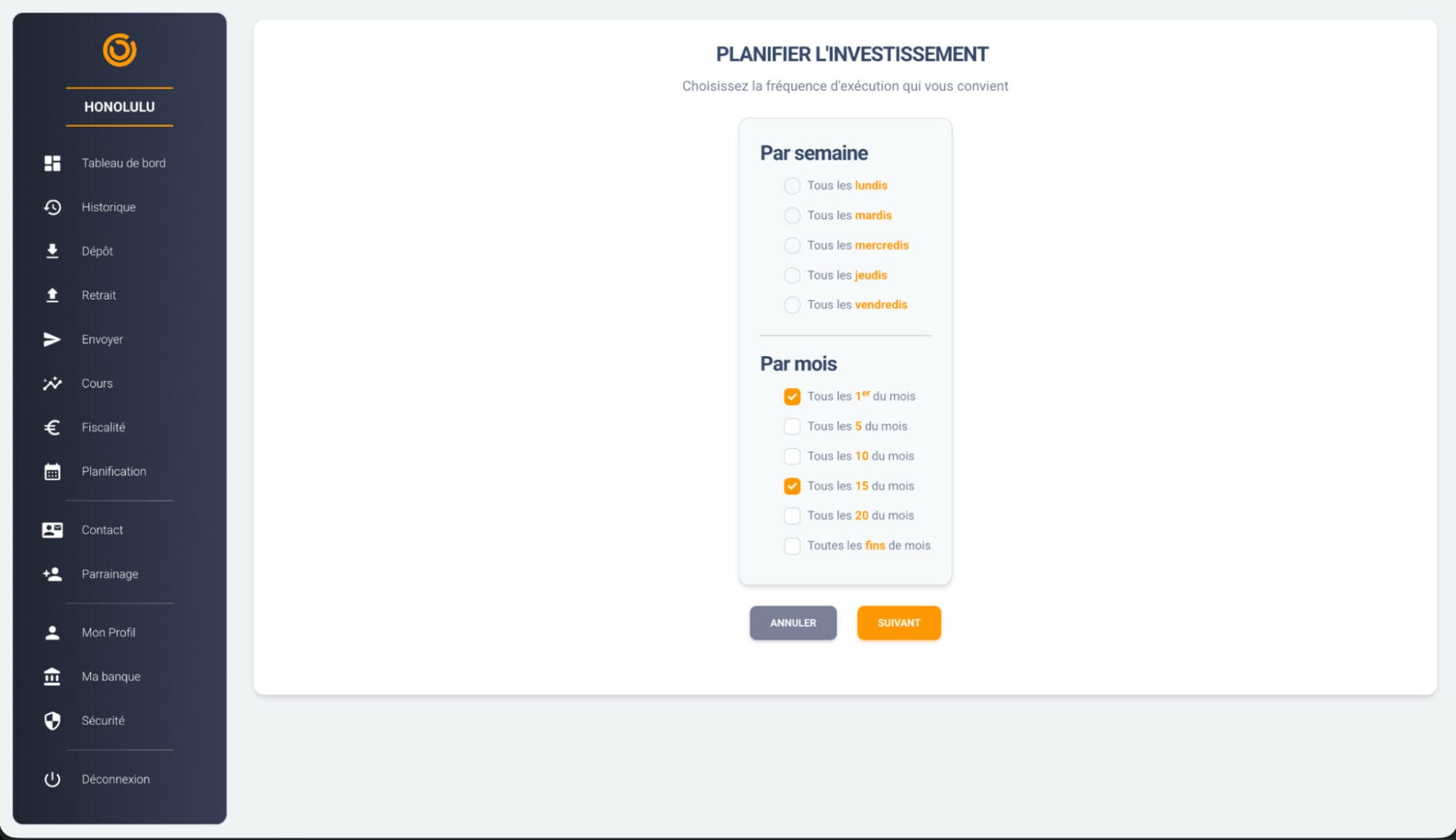 CrypCool propose aussi une fonction de planification d’investissement (DCA) particulièrement simple. Vous définissez le montant à investir, la répartition entre vos cryptos préférées (BTC, ETH, VRO) et la fréquence d’exécution. La plateforme s’occupe du reste, pour un investissement progressif et sans stress.