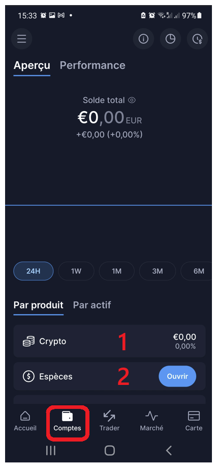 Pour déposer, rendez-vous sur l’onglet « Comptes ». Choisissez « Cryptos » (1) pour déposer des jetons ou « Espèce » (2) pour déposer des euros. Laissez-vous ensuite guider pour finaliser votre dépôt.