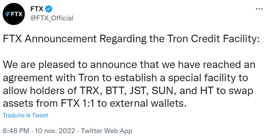 Les utilisateurs de FTX pourront donc retirer leur jetons TRX, BTT, JST, SUN et HT (Huobi Token) vers des wallets extérieurs. Justin Sun permet ainsi à SBF de résoudre une partie du problème de liquidité et aux utilisateurs bloqués d’essayer de sauver les meubles via le réseau Tron.