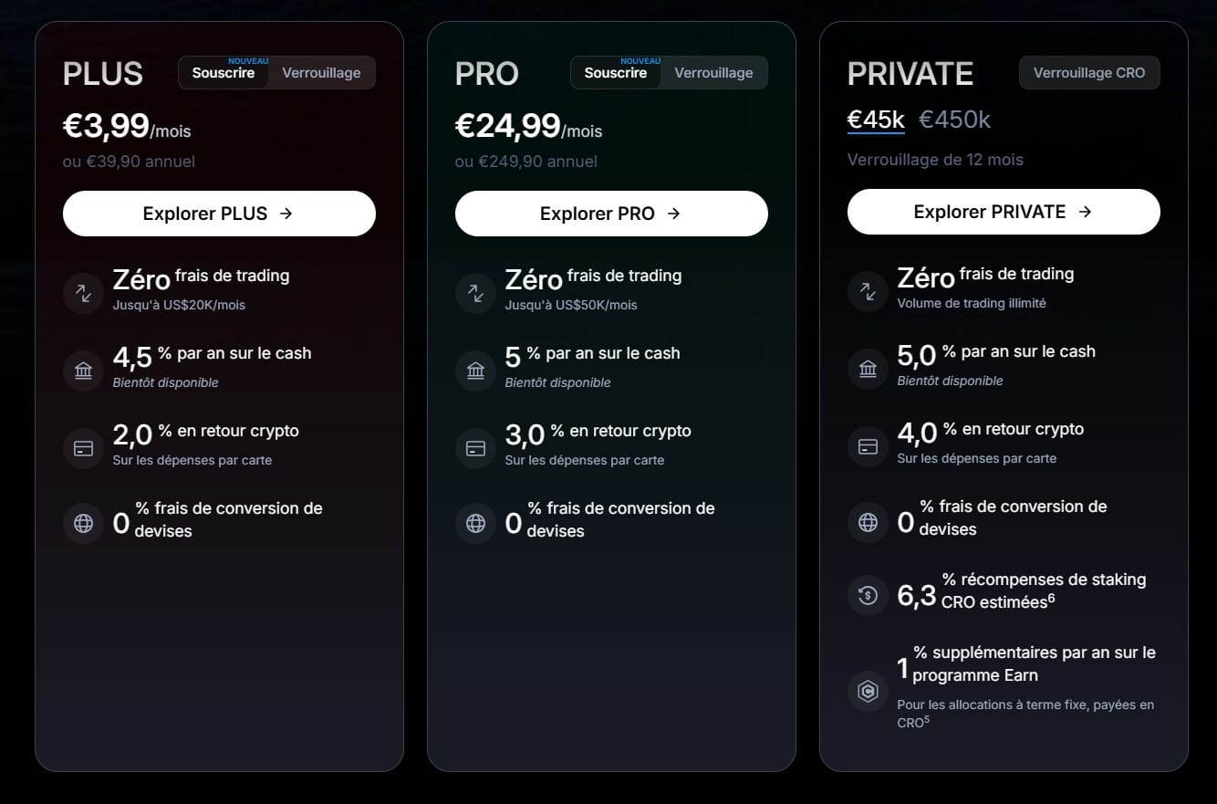 - Un abonnement classique en euros, pour ceux qui privilégient la simplicité et souhaitent éviter une exposition à la volatilité du CRO ;