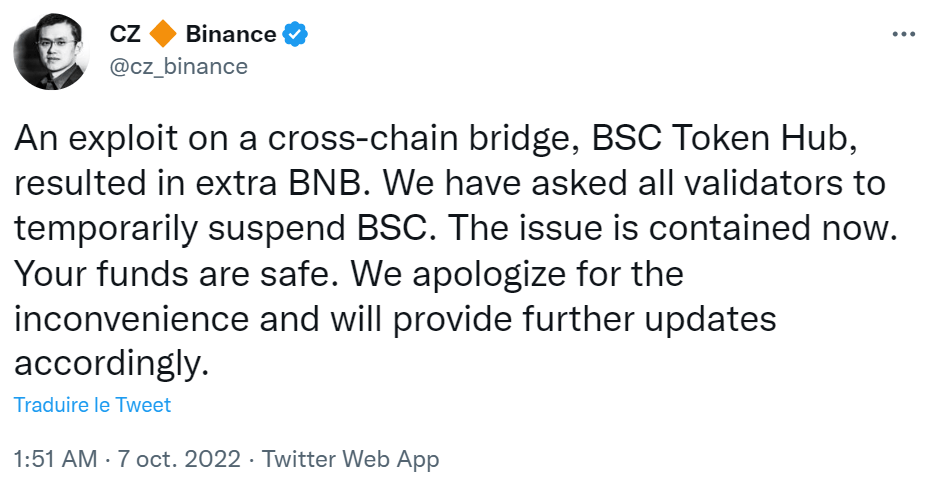 On ne badine pas avec CZ – Début octobre, la plus grande plateforme d’échange cryptos du monde (en termes de volume quotidien) a subi une attaque informatique sur l’un de ses ponts. Avec à la clé, un butin retentissant : on parle ici de plus de 500 millions de dollars subtilisés. Pas du genre à se laisser faire, le PDG de Binance Changpeng Zhao est monté au créneau pour retrouver les fonds et les sécuriser. Grâce à une coopération avec les autorités, l’exchange serait sur le point d’identifier le hacker.