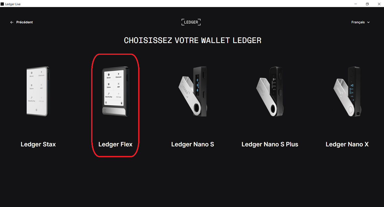 Une fois Ledger Live lancé, sélectionnez le modèle Flex pour obtenir les informations associées. Choisissez le français pour plus de confort et téléchargez-le sur le wallet.