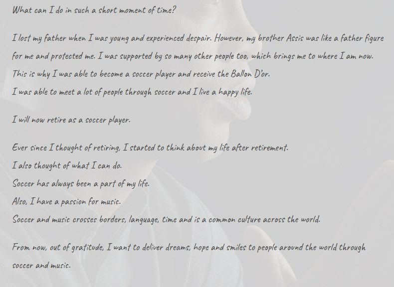 - Mais malgré ça, n’oubliez pas que le football lui a offert une belle vie, alors il veut vous donner en retour un peu de ce qui lui a été gracieusement offert ;