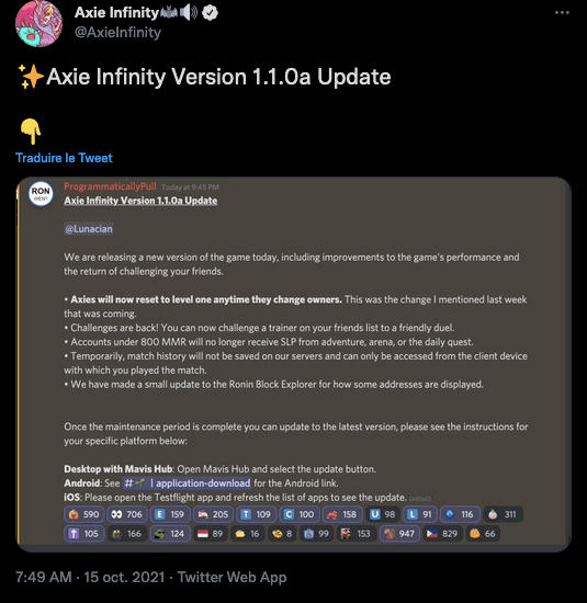 Tweet d'Axie Infinity annonçant : pas de récompense en SLP en dessous de 800 MMR