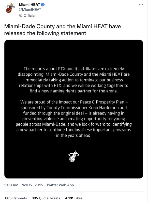 « Les rapports sur FTX et ses affiliés sont extrêmement décevants. Le comté de Miami-Dade et le Miami Heat prennent immédiatement des mesures pour mettre fin à nos relations commerciales avec FTX, et nous collaborerons pour trouver un nouveau partenaire de droits de dénomination pour l’arène. (…)»