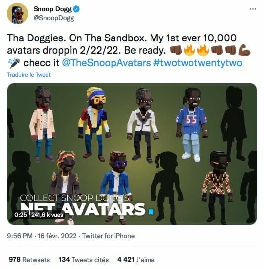 C’est une excellente nouvelle pour les fans de Snoop Dogg et les amateurs de The Sandbox. Les 10 000 NFT d’avatar de Snoop Dogg sortent juste à temps pour l’ouverture de l’Alpha Season 2. Effectivement, les Doggies seront mint en ce 22 février 2022. Avec plus de 150 traits, chaque avatar est unique et il y en a pour tous les goûts.