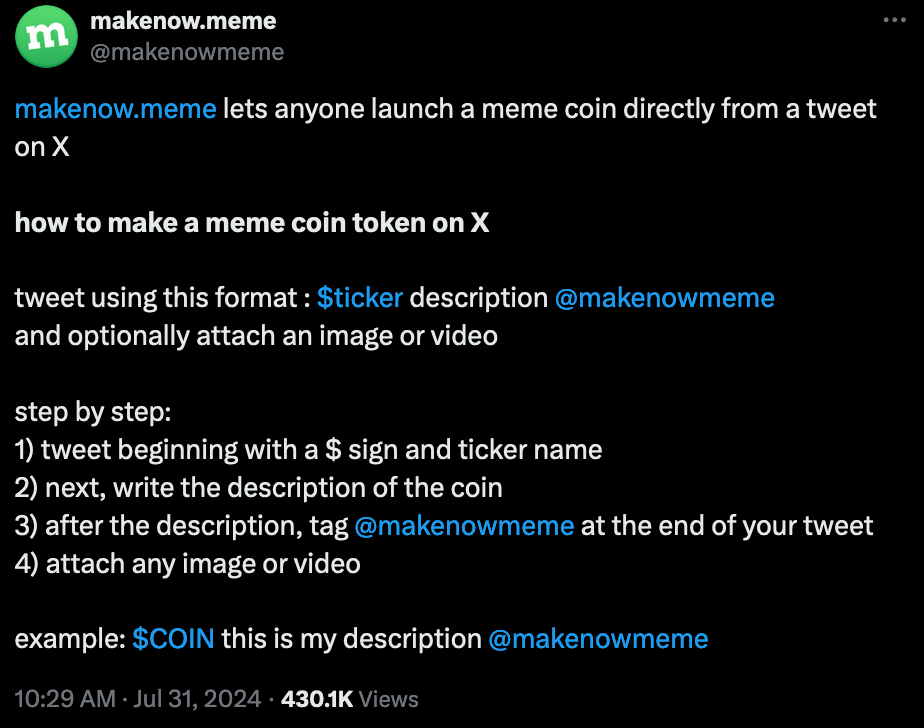 Pour cela, l’utilisateur doit réaliser un tweet qui comporte le ticker du jeton, sa description et qui tag @makenowmeme. Il est également possible d’ajouter une image à sa publication afin qu’elle soit utilisée comme image pour le jeton.