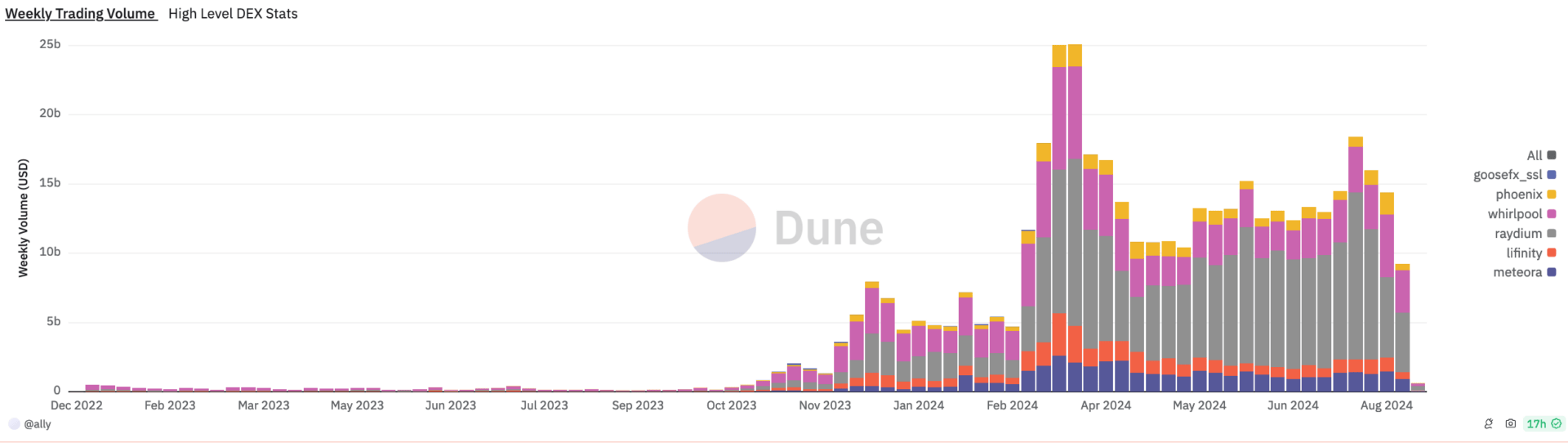 Les memecoins sont depuis plusieurs mois le centre d’intérêt sur Solana. En mars dernier, les DEX de Solana ont enregistré des volumes records avec plus de 23 milliards de dollars par semaine.