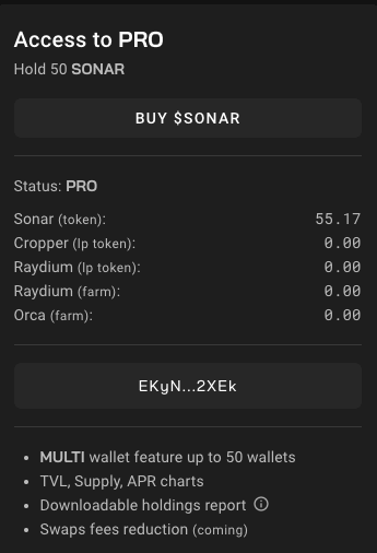 Un certain nombre de fonctionnalités supplémentaires seront offertes aux soutiens Pro du projet, notamment des statistiques en temps réel plus détaillés sur tous vos investissements : si vous êtes fans de TVL (Total Value Locked, pour les fonds placés sous séquestre dans un protocole), que vous n’investissez dans un projet que si vous connaissez précisément sa supply totale, ou encore que vous cherchiez un suivi de vos rendements encore plus détaillé ou une fonctionnalité d’export automatique de l’évolution de vos vos portefeuilles téléchargeable en quelques clics, vous êtes au bon endroit ! L’offre Pro vous permet également d’agréger formellement le suivi de plusieurs wallets au sein d’une seule interface, et le projet réfléchit à offrir à terme des fees de swap de cryptomonnaies réduits sur le DEX Sonar.