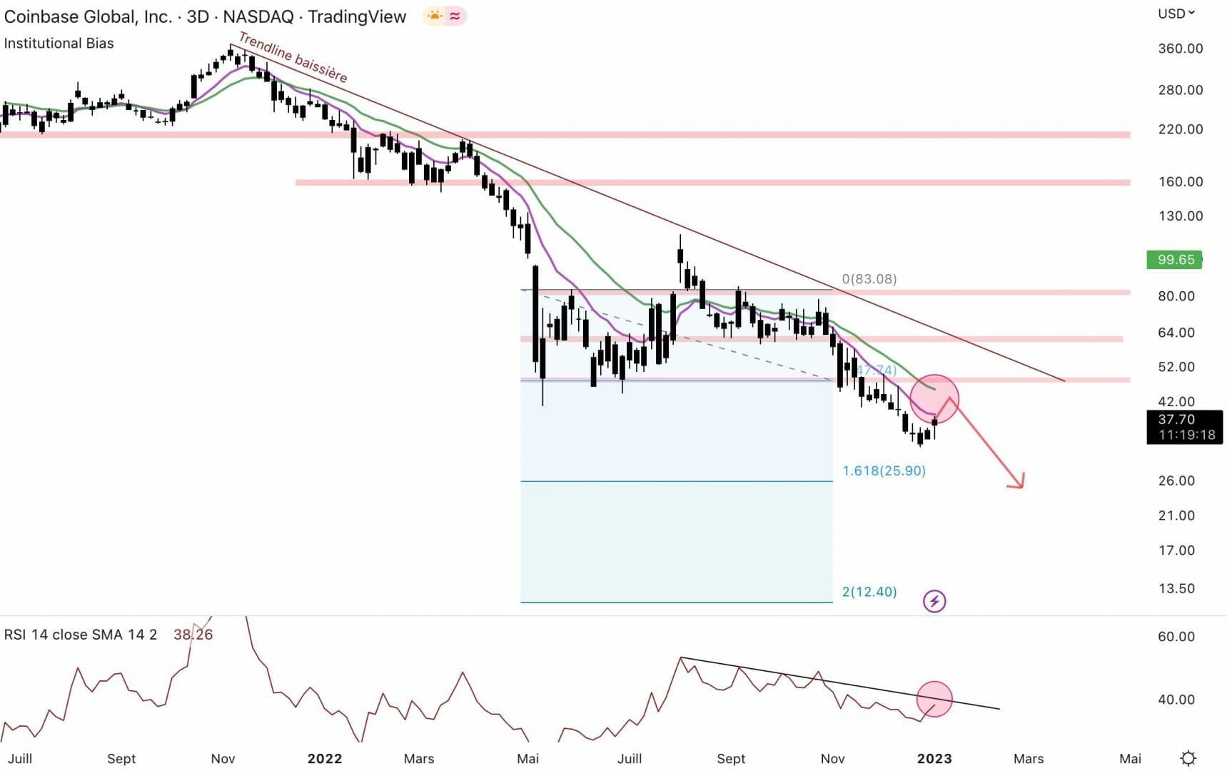 La semaine dernière, nous évoquions la possibilité d’une chute sévère sur Coinbase avec des objectifs situés entre 26 $ et 12,5 $. Ces objectifs sont toujours d’actualité, car le rebond en cours reste très fragile. Outre le fait qu’il ne s’agisse que de quelques pour cents de hausse, le biais institutionnel pourrait repousser le cours dans les jours à venir (flèche rouge).