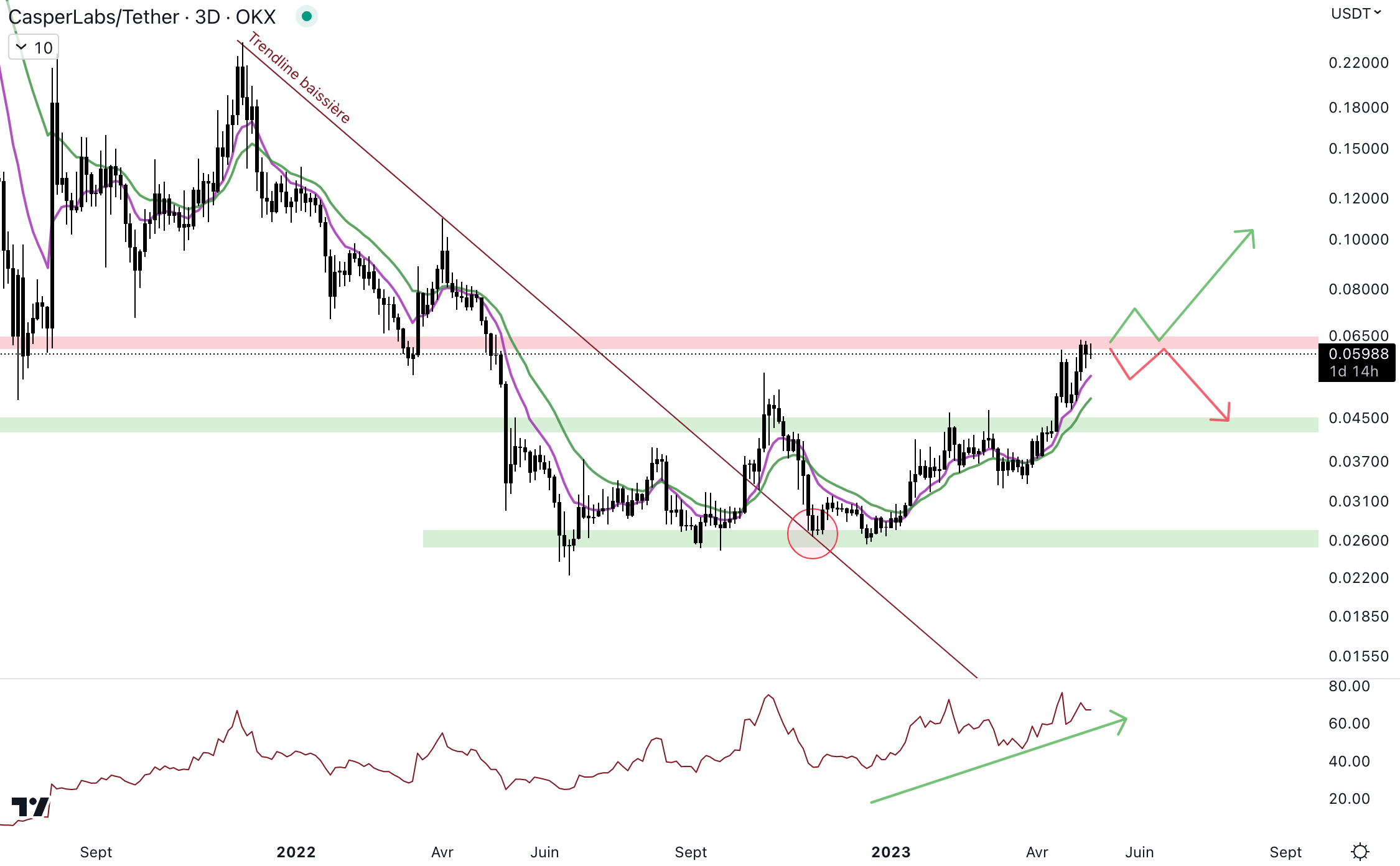 Pour le moment, la dominance du Bitcoin continue d’être orientée à la hausse. Le Bitcoin attire les capitaux, et une clôture au-dessus de 49 % serait signe de continuation haussière. La paire ETH/BTC est toujours fragile, il faudra attendre que le cours casse la trendline baissière pour retrouver des couleurs. Si le leader des altcoins redevient solide face au Bitcoin, les altcoins pourraient en profiter. Casper est l’altcoin de la semaine, il est en hausse de plus de 10 % en une semaine. Il affiche une dynamique haussière depuis janvier 2023, mais il évolue au niveau d’une résistance importante. Si elle cède, le cours pourrait grimper en direction de la prochaine résistance à 0,095 $.