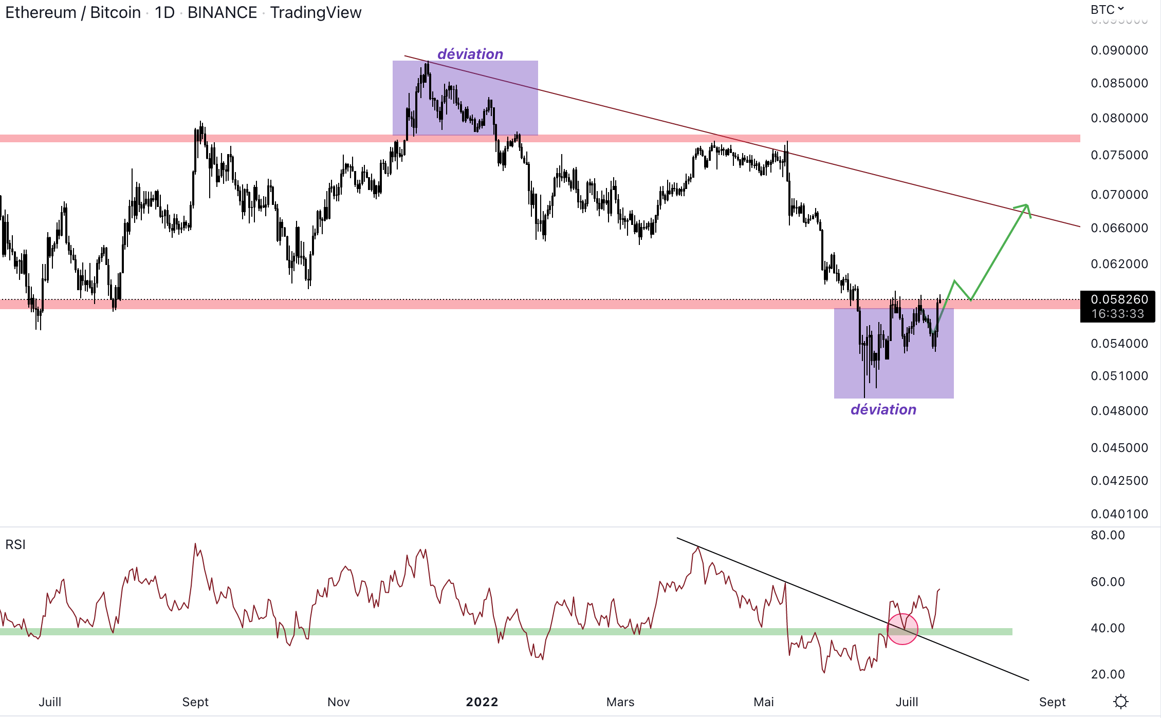 En revanche, si la dominance chute, les altcoins pourraient alors rebondir et tenter de casser le support à la baisse. Une cassure du support serait un signal à ne pas négliger côté altcoins. Cependant, cela reste peu probable au vu du contexte macroéconomique et quand on voit la situation des cryptomonnaies. Il faut néanmoins préparer son plan pour chaque situation.