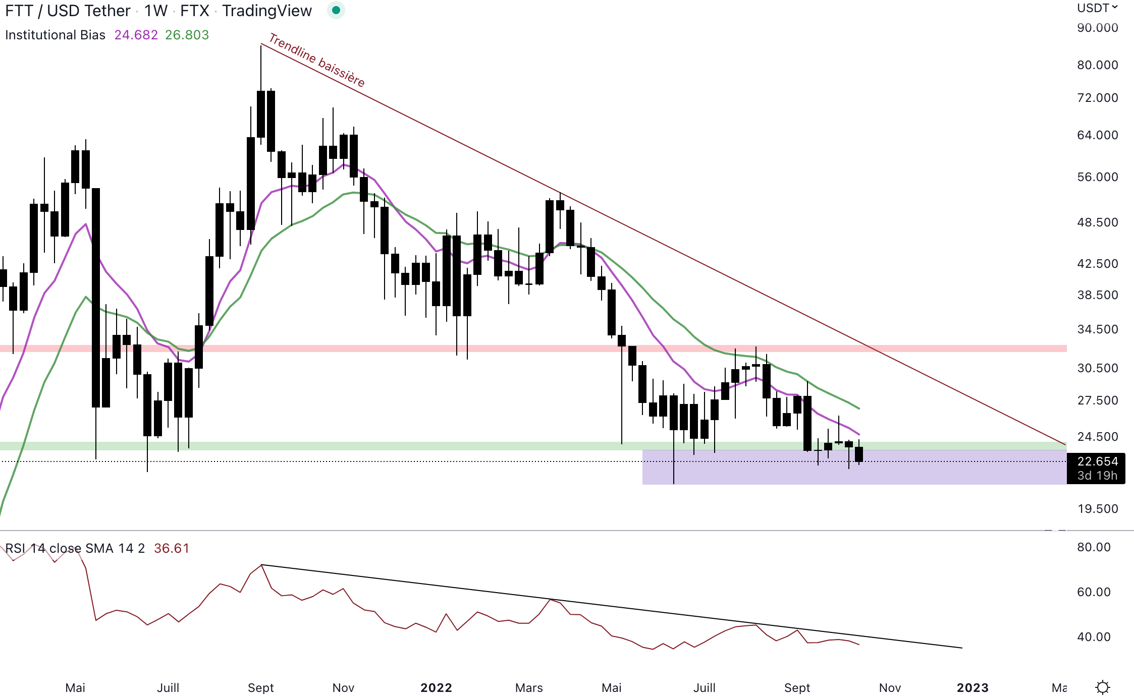Alors que le FTT évolue dans un range hebdomadaire entre 32 $ et 24 $, le cours glisse dangereusement sous le support hebdomadaire :