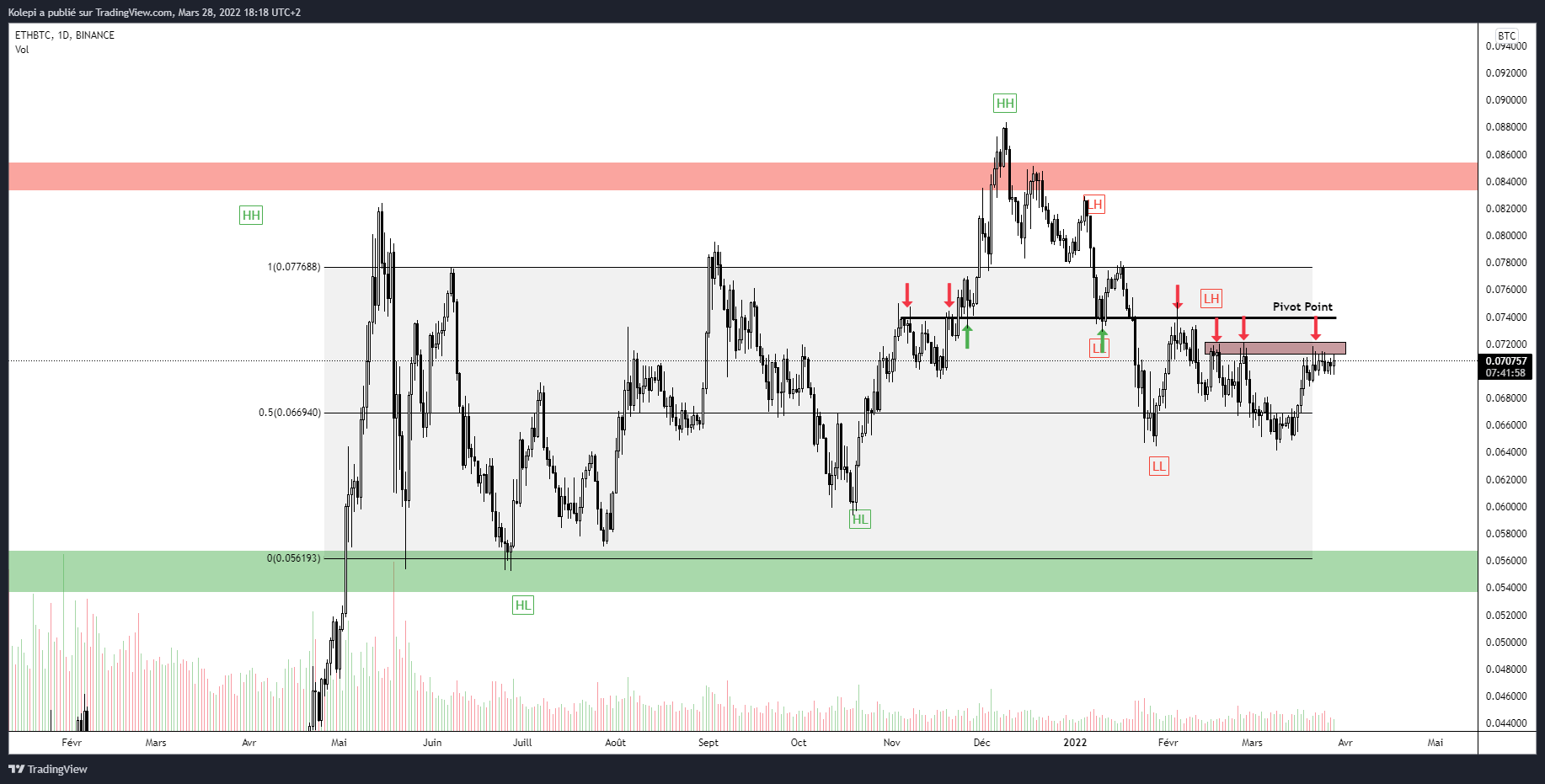 Le scénario le plus haussier serait de passer ce niveau des 74 000 satoshis, ce qui modifierait la structure du marché, et ferait passer le ratio Ethereum/Bitcoin dans une claire tendance haussière.