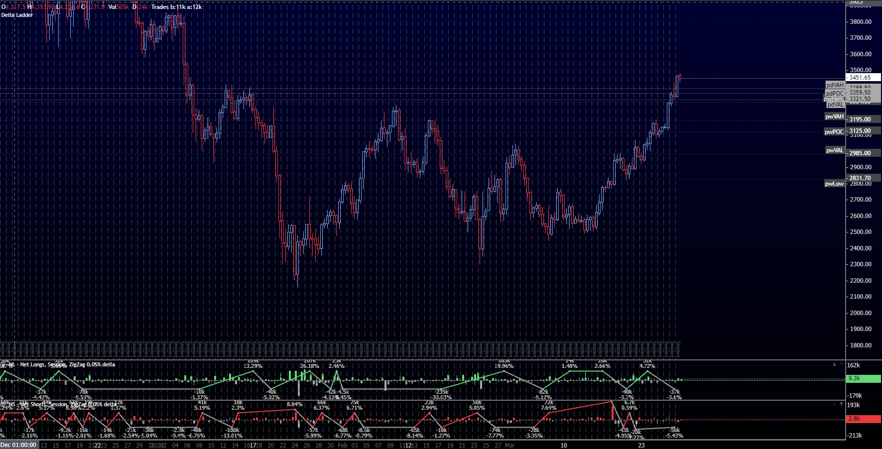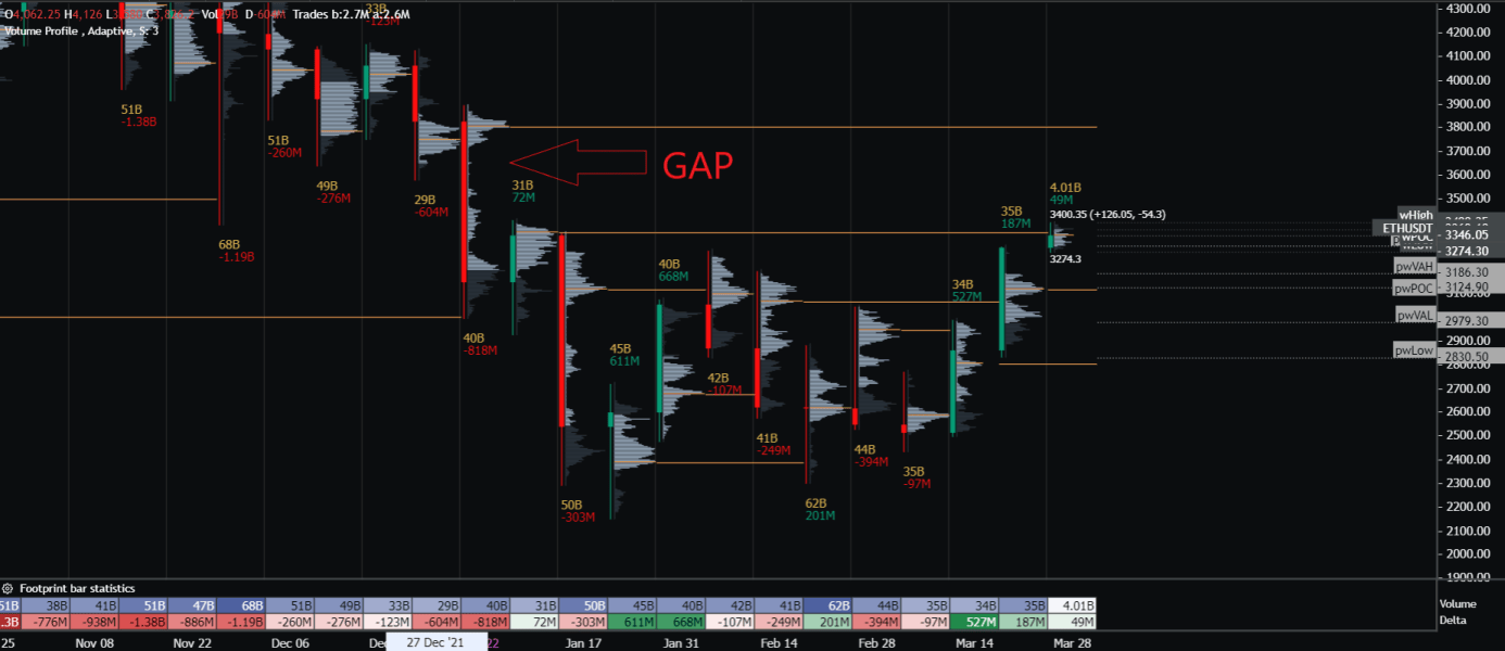 Comme observé sur le graphique plus traditionnel, nous pouvons voir un très clair gap (écart) de volume au niveau des 3 600$. Ces gaps tendent généralement à être comblés, d’où le fait que je le surveille particulièrement.