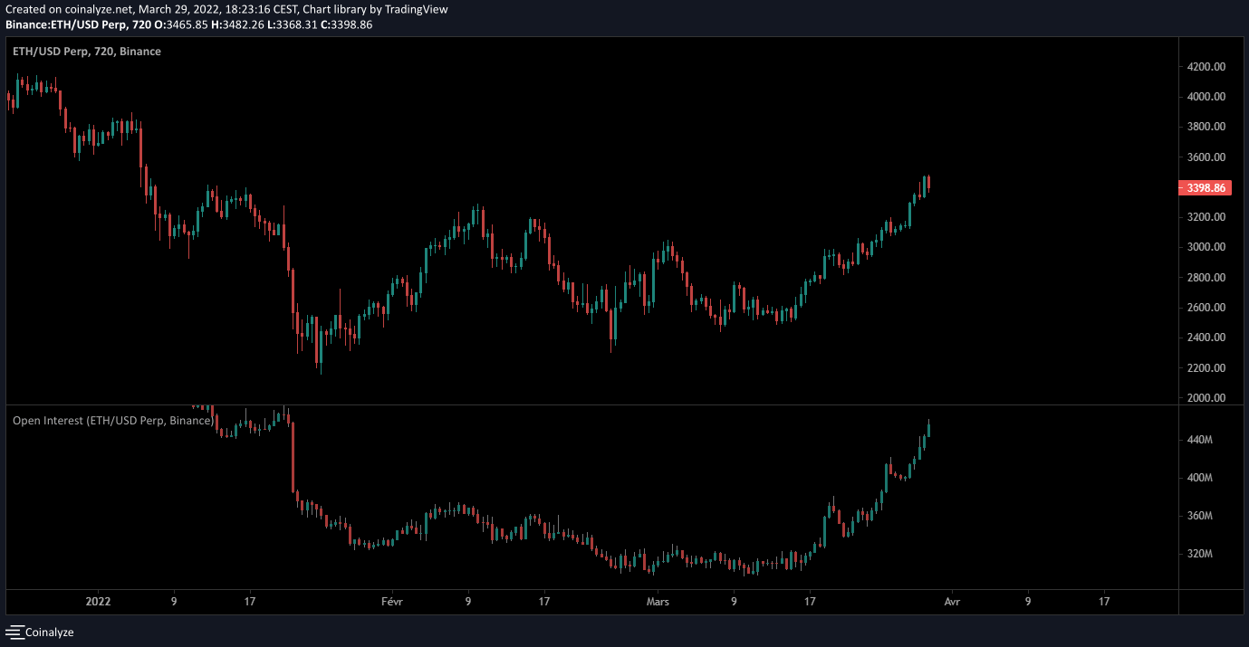 Le plus gros soucis avec cette hausse de l’Ethereum, est qu’elle est en majorité soutenue par des effets de levier. C’est à dire un mouvement de marché peu sain, alimenté par la spéculation. Nous pouvons très rapidement le constater en regardant la courbe de l’Open Interest. Les hausses soutenues par des leviers sont rarement une bonne chose, car les positions prises avec du levier sont soumises au risque de liquidation ou de Stop Loss, pour les plus responsables.