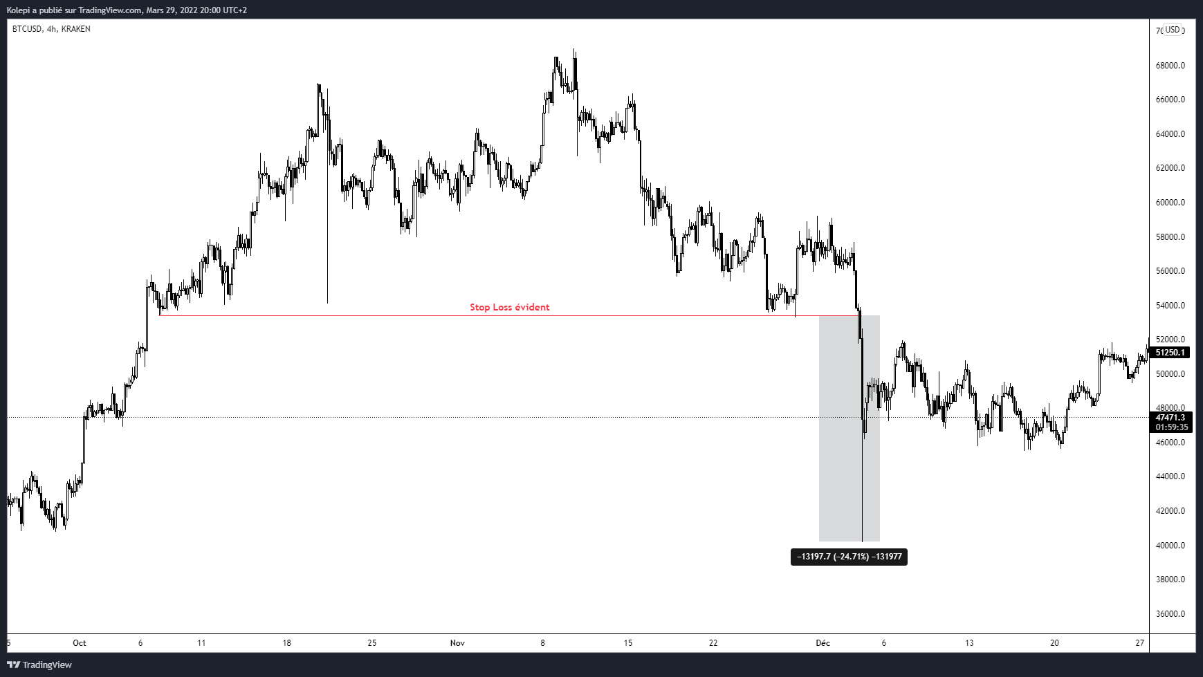 Le trader qui voit son Stop Loss déclenché est contraint de facto de racheter/vendre sa position au prix du marché, ce qui accroît la volatilité en quelques fractions de seconde et peut déclencher d’autres Stop Loss. On peut apercevoir ce type de phénomène par exemple sur le graphique ci dessous.