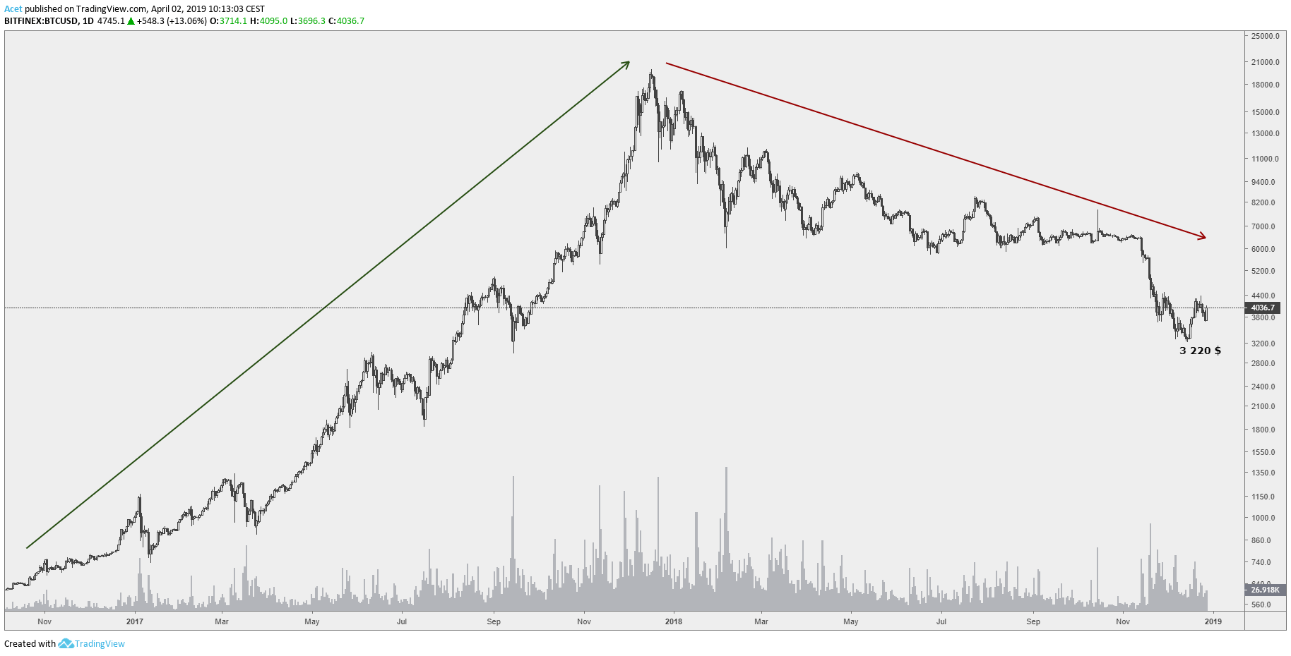 Bitcoin est actuellement dans un contexte particulier. Après avoir connu une période de très forte croissance en 2017 – une bulle spéculative – il a connu une année 2018 très baissière, atteignant un plus bas à 3 220$ en décembre 2018.
