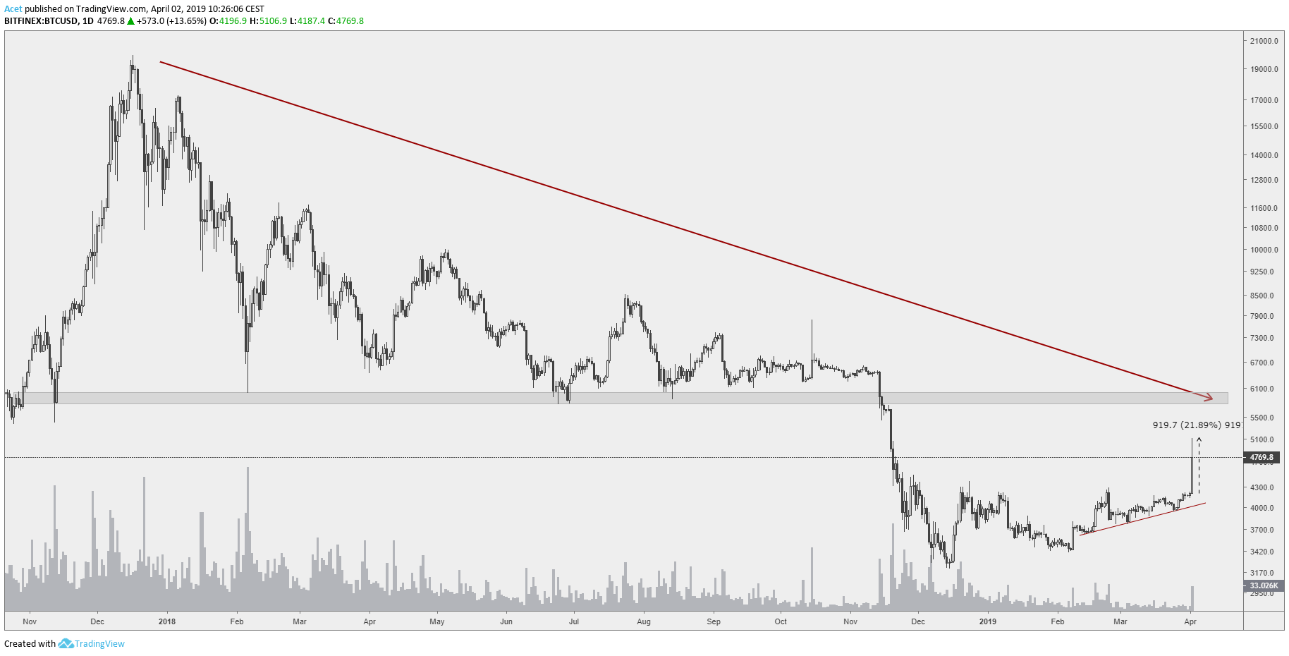 Ce matin, Bitcoin est finalement sorti de sa caverne. À 6h30 il a franchi les plus hauts de décembre 2018, enregistrant en quelques heures une croissance supérieure à 20% avec de forts volumes.