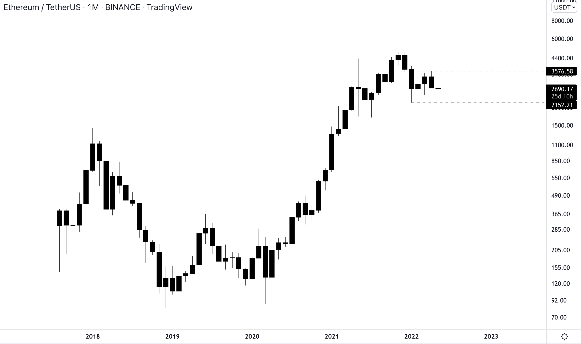 Le Bitcoin étant très corrélé aux marchés américains, comme expliqué dans cet article, il est actuellement compliqué pour les cryptomonnaies de s’exprimer pleinement. C’est bien sûr le même problème pour Ethereum qui est lui-même très corrélé à ce que fait le Bitcoin. En revanche, on voit qu’Ethereum reste très solide techniquement. Il est actuellement dans une dynamique haussière primaire. Il faudra confirmer cela en conservant 2 150 $ en clôture en mensuel. La mise à jour The Merge a été de nouveau repoussée, il faudra rester attentif à cet événement.