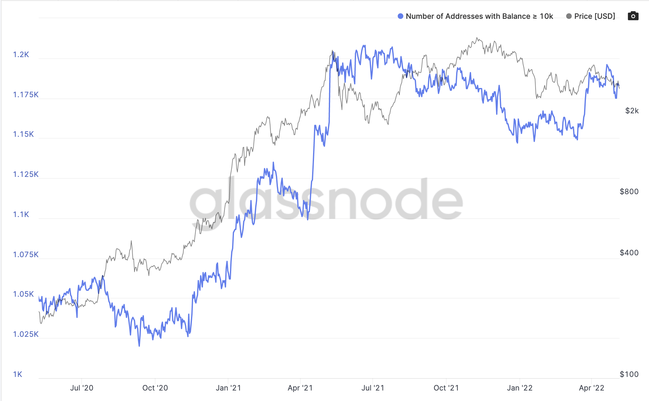 L’analyse on-chain est souvent très intéressante, car elle permet d‘analyser les transactions directement sur la blockchain. Elle permet de connaître le comportement des gros portefeuilles. Les whales sont des entités possédant plus de 1 000 BTC. Pour Ethereum, il est intéressant de regarder le comportement des entités ayant plus de 10 000 ETH :