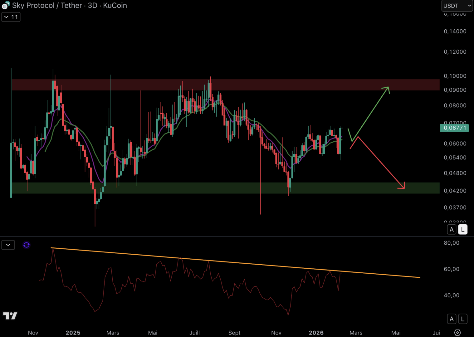 Le top 3 des actifs les plus performants sur les sept derniers jours est complété par MYX Finance (MYX) et MemeCore (M). MYX progresse de 12 % et M est en hausse de 10 %. Allons tout de suite analyser techniquement SKY.