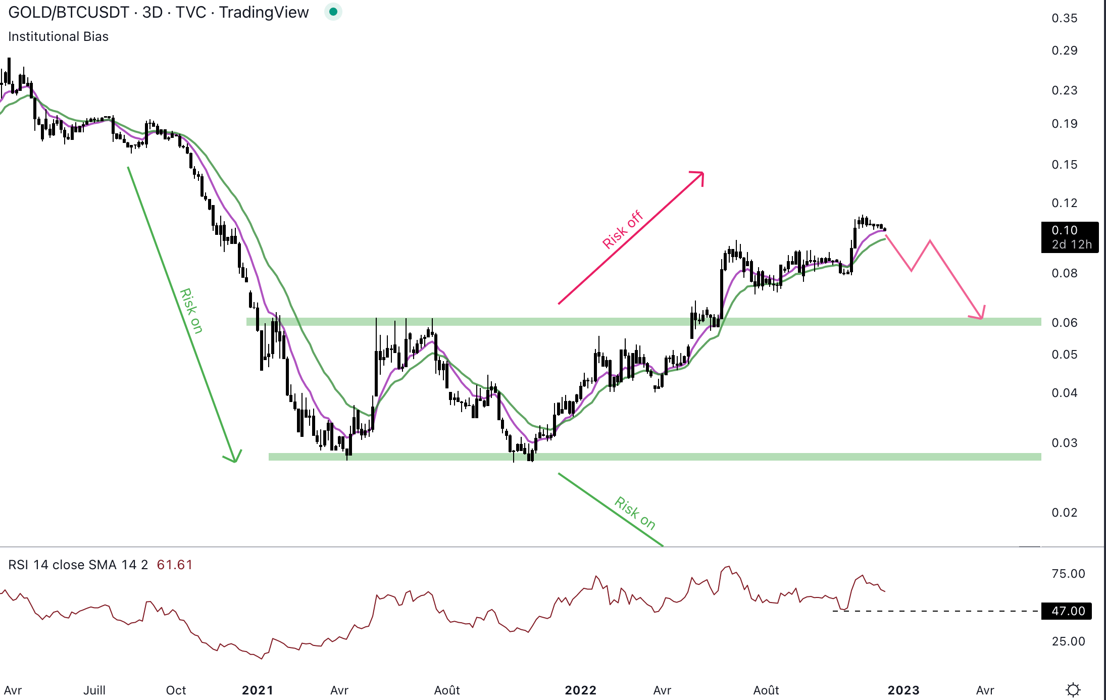 Le cours a rebondi plusieurs fois au niveau des EMAs. Il est tout à fait possible qu’il s’appuie une nouvelle fois sur le biais institutionnel pour rebondir encore. Le scénario bullish pour les cryptomonnaies serait de chuter sous les EMAs, et de revenir au niveau du support hebdomadaire. Aussi, le momentum affiche une divergence qui pourrait être confirmée en chutant sous 47 de RSI. Si c’est le cas, il pourrait s’agir d’un top pour la paire GOLD/BTCUSDT.
