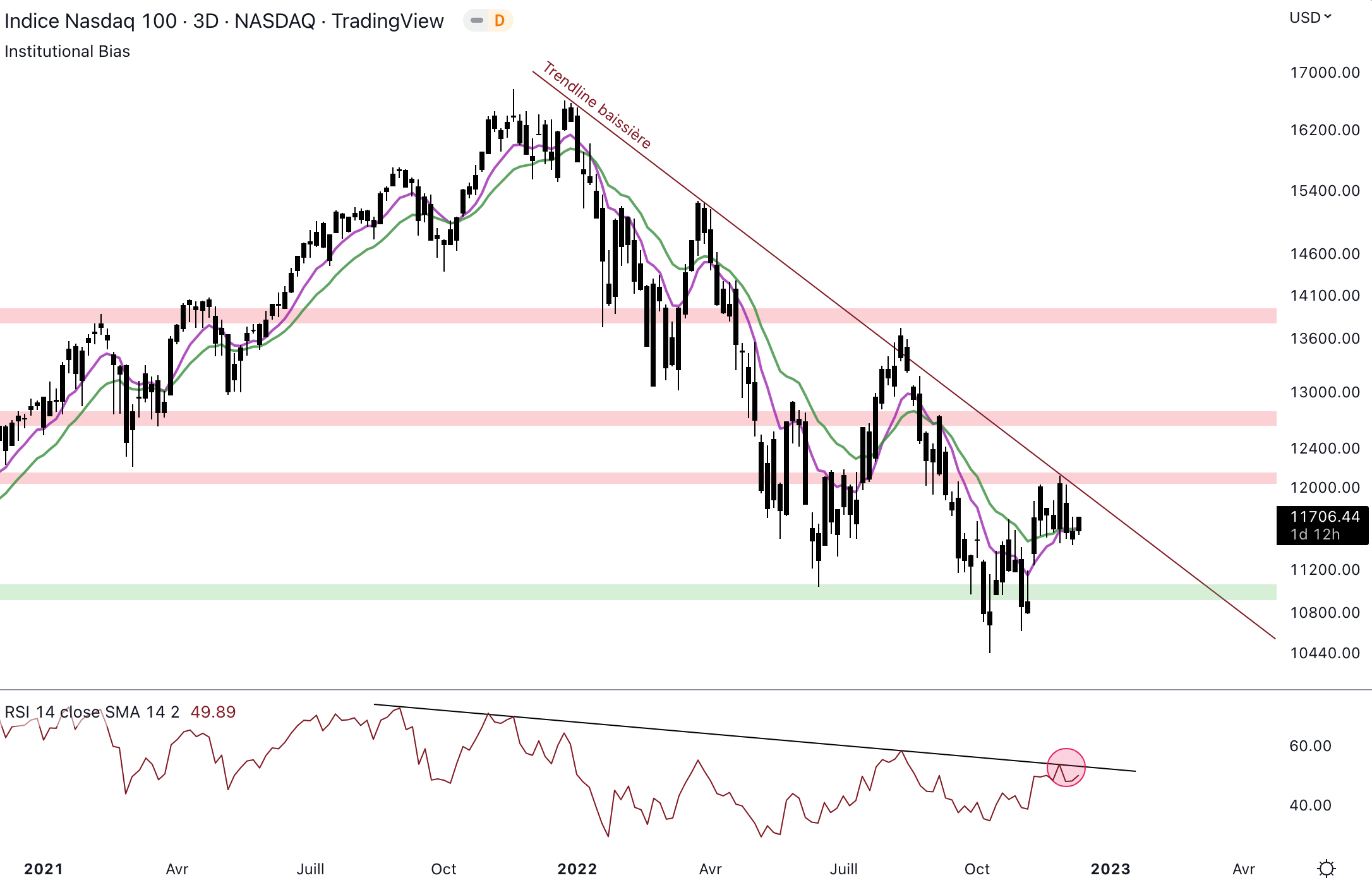 Le momentum est également fragile, car le RSI évolue toujours sous la trendline baissière. Un nouveau rejet s’est fait il y a quelques jours. Un dépassement de 58 de RSI serait un signal bullish pour le NASDAQ.