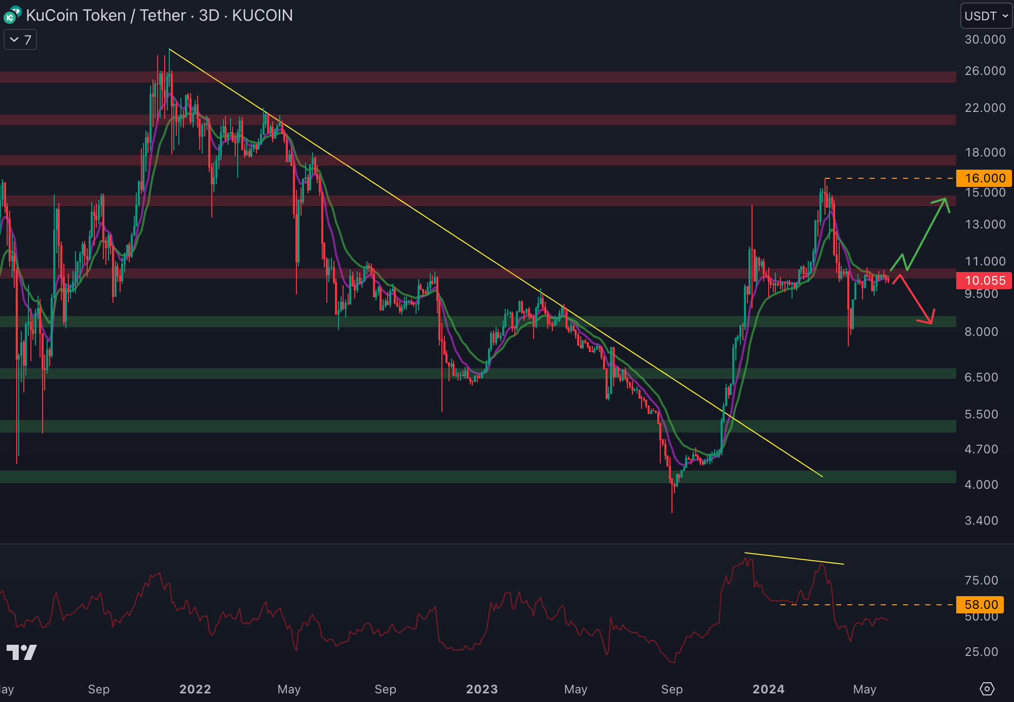 Contrairement à l’OKB, le KCS de Kucoin n’affiche pas une dynamique clairement haussière depuis plusieurs mois. La dynamique haussière est même remise en cause depuis la cassure du dernier creux autour des 9 $. Les acheteurs ont réagi sur le support à 8,5 $, et le cours stagne au niveau de la résistance à 10,5 $ depuis plusieurs jours :