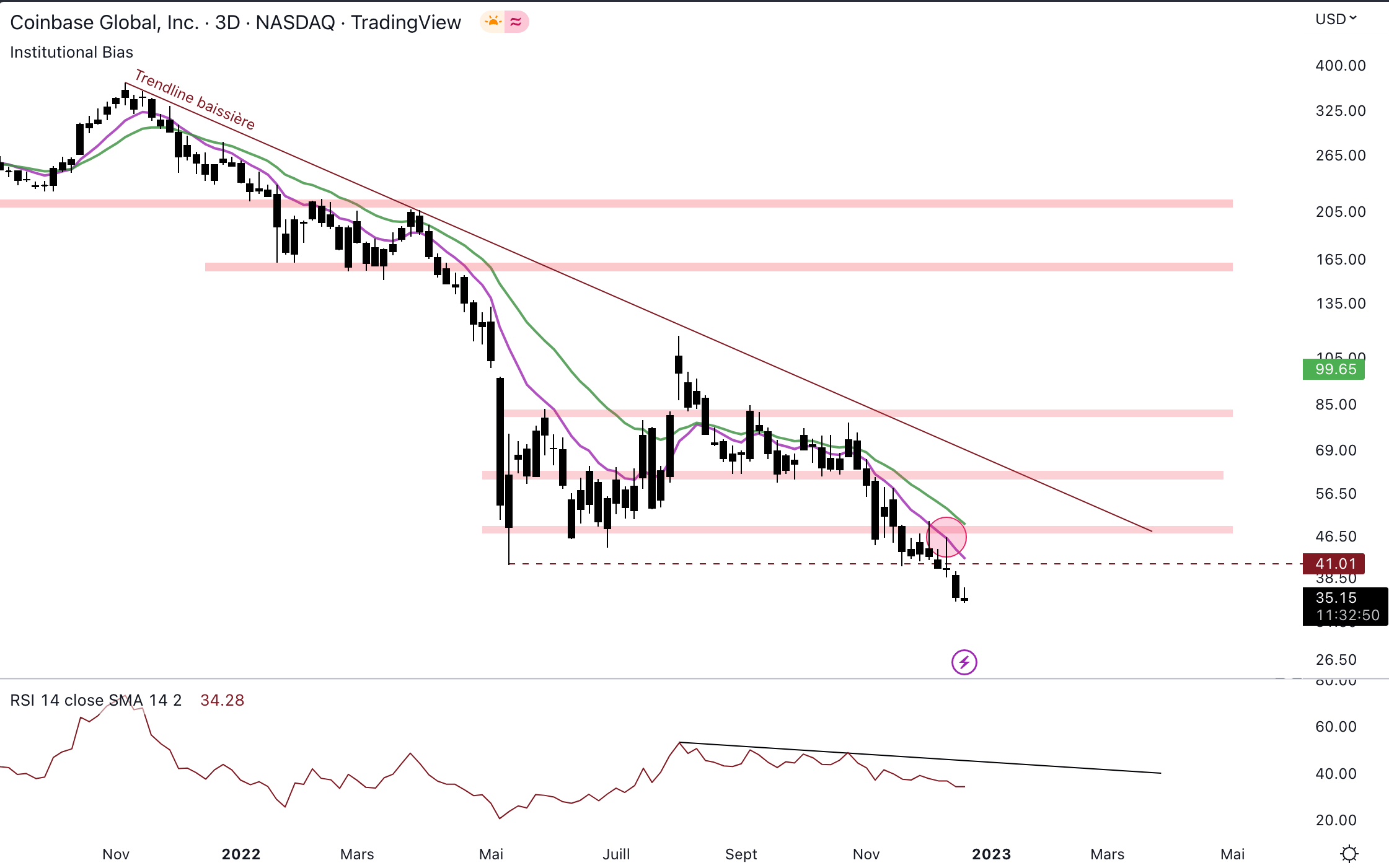 Le cours de Coinbase n’est pas en forme. En effet, le cours a chuté et a marqué un nouveau plus bas historique sous 35 $ :