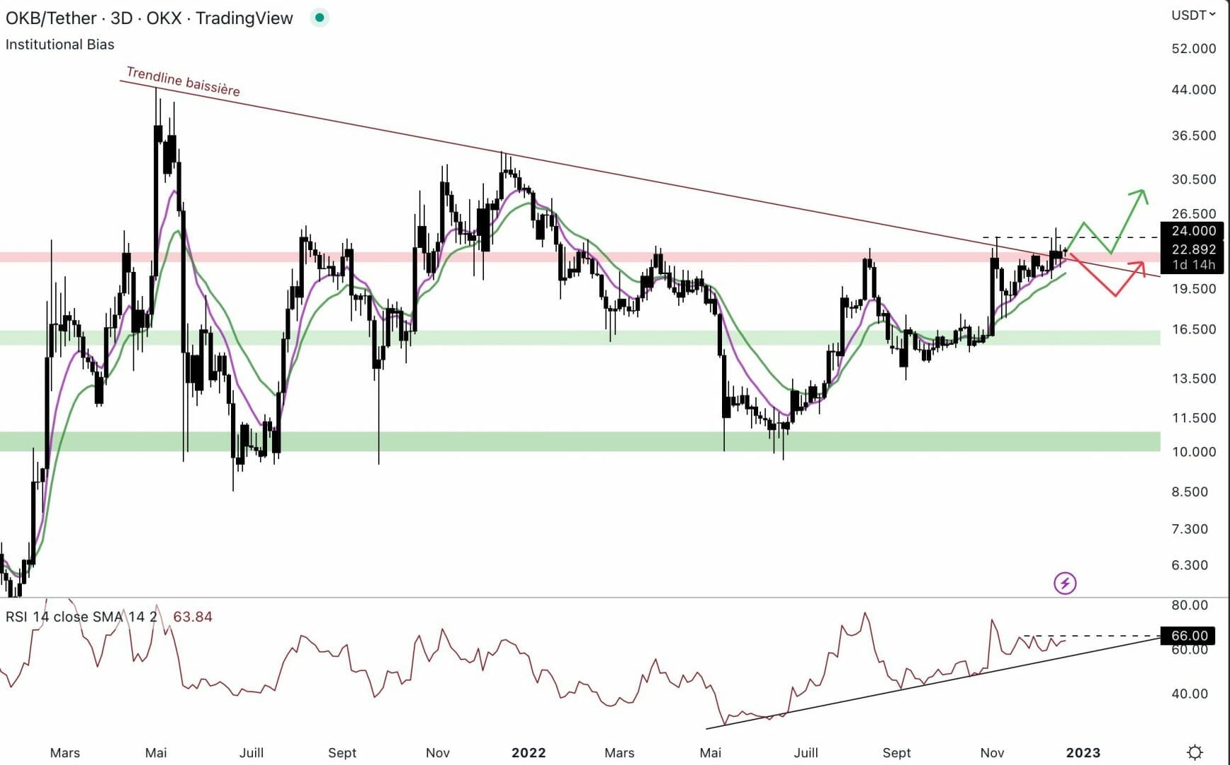 Les acheteurs continuent de se montrer sur cet actif. Cependant, il faut une clôture au-dessus de 24 $ pour confirmer la tendance avec des creux et des sommets ascendants. Le cours se trouve légèrement au-dessus de la trendline baissière, mais les vendeurs peuvent faire repasser le cours en dessous dans les prochaines semaines (flèche rouge). Si le Bitcoin retrouve le chemin de la hausse, le OKB pourrait bien en profiter. Si le cours arrive à dépasser et clôturer au-dessus de 24 $, le prochain objectif sera de dépasser 34 $.