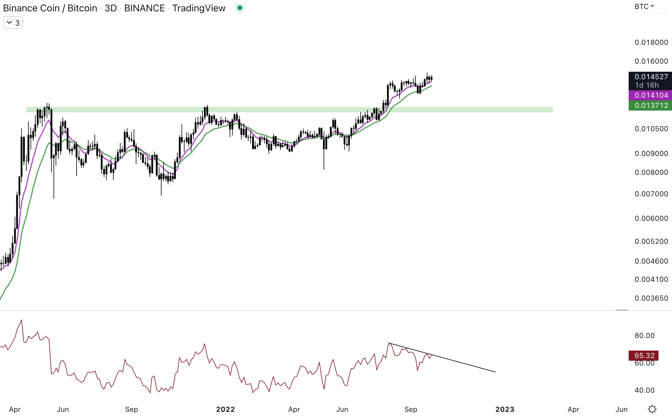 La tendance reste haussière contre le Bitcoin. Le cours évolue toujours au-dessus du support et le biais institutionnel sert de support au cours. Une clôture au-dessus du dernier plus haut témoignerait d’une poursuite de la tendance avec un « W » de continuation. La tendance ne semble pas faiblir malgré une tendance globalement baissière sur les cryptomonnaies. Sur le RSI, il faudra s’affranchir de la trendline baissière pour éviter de mettre en place des divergences baissières. Il faudra rester attentif à tout signe de faiblesse sur ce graphique, car cela se répercuterait directement sur le cours BNB/USDT.