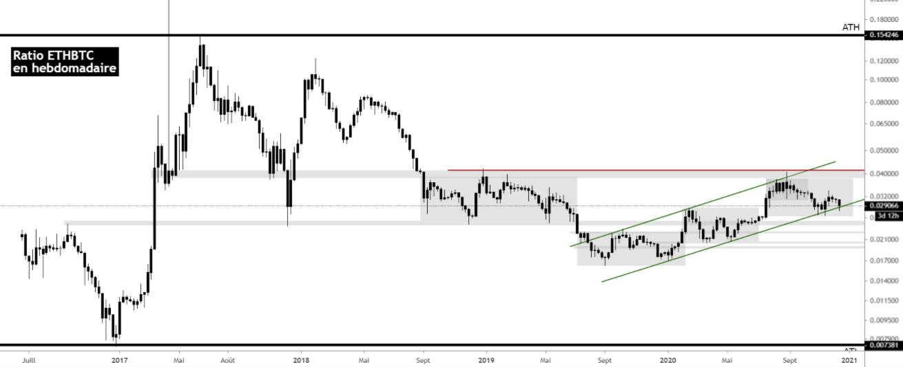 Une des métriques intéressantes à suivre est le ratio de prix ETH/BTC.