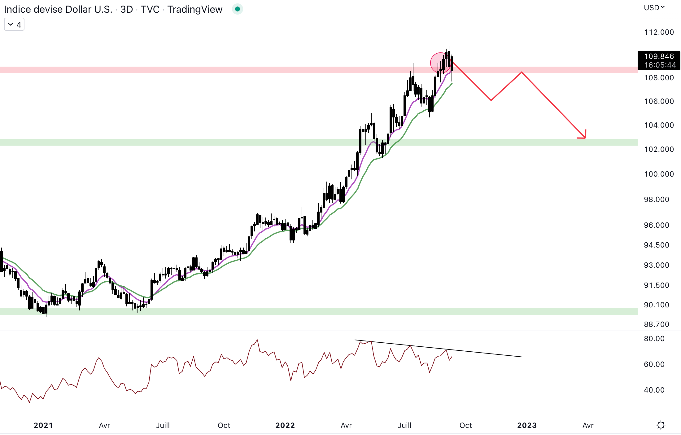 Le momentum montre un fort essoufflement avec une divergence confirmée sur le RSI et une autre qui pourrait l’être dans les jours ou semaines à venir. Un dollar faible permettrait aux actifs risqués de reprendre de la force.