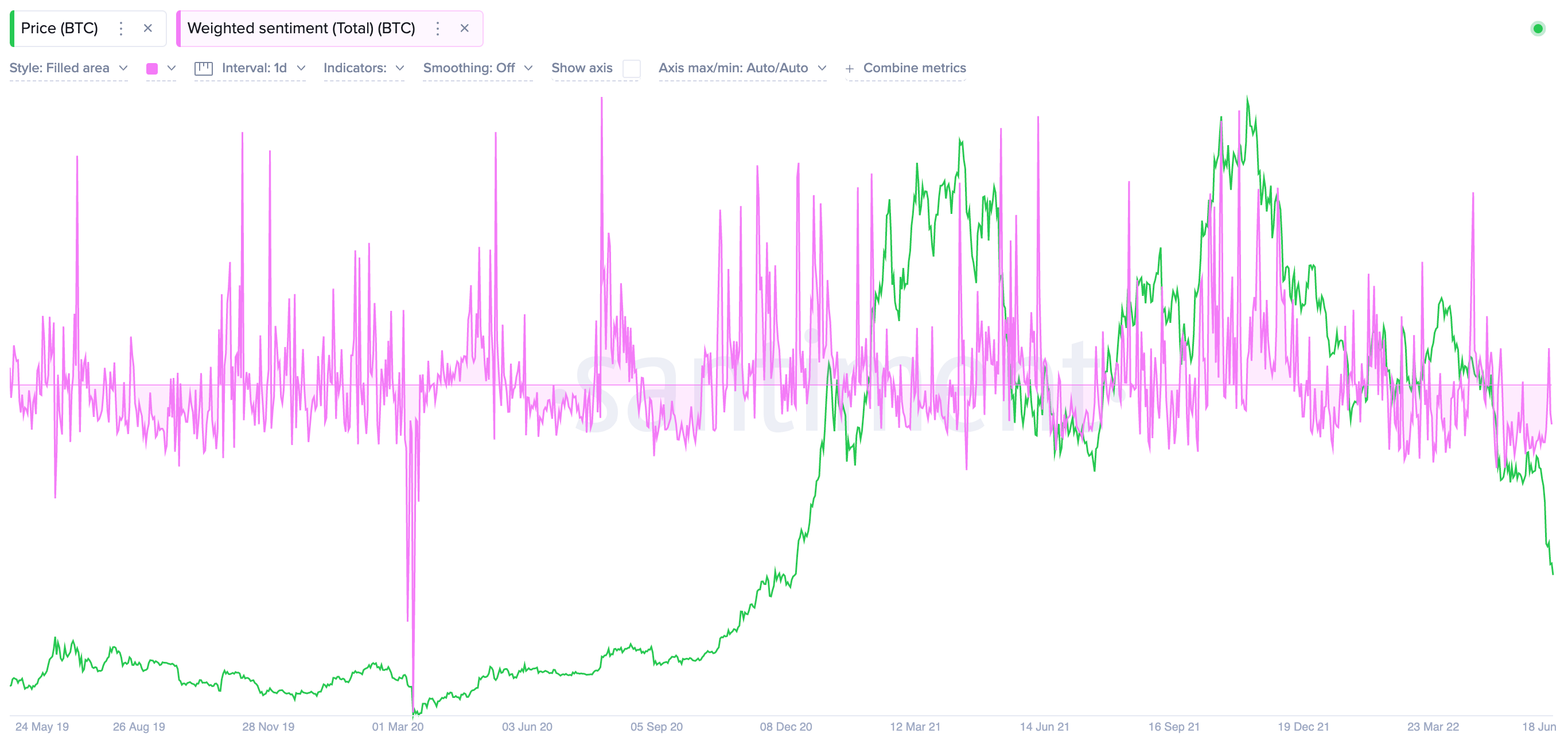 Le weighted sentiment regroupe des données sur les réseaux sociaux pour en faire un indicateur. D’après cet indicateur, qui a un calcul différent du Crypto Fear and Greed, la situation n’est pas aussi chaotique que lors du krach Covid. Les acteurs ne semblent pas être dans une situation de peur extrême comme début 2020. Il n’est pas nécessaire d’avoir un pic similaire au krach Covid, mais on ne peut pas conclure que nous assistons à une capitulation sur cette métrique.