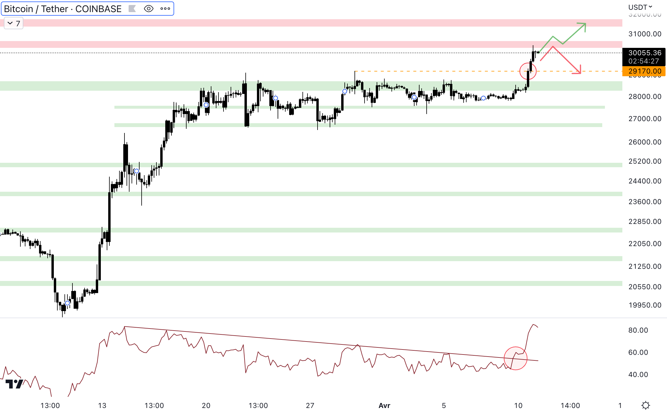 Après plusieurs semaines à osciller autour de 28 000 $, les acheteurs ont réussi à pousser pour revenir au-dessus de 30 000 $. Le cours du Bitcoin (BTC) est désormais au niveau d’une zone technique très importante. En effet, c’est cette zone qui avait permis un rebond en mai 2021, elle avait ensuite cédé en juin 2022 :