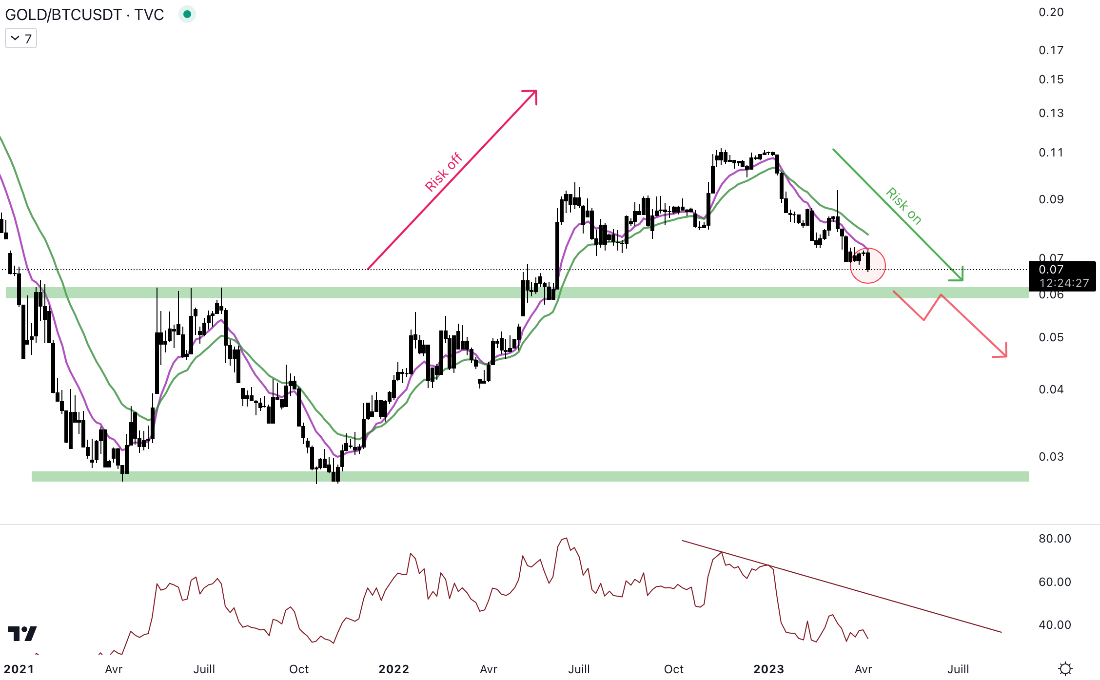 Le cours de la paire Or/BTC se dirige vers le support hebdomadaire. Les opérateurs se tournent vers le Bitcoin actuellement. Un rebond pourrait intervenir au niveau du support, il faudra être vigilant. Il serait très positif de revoir la paire en dessous du support hebdomadaire. Le RSI évolue sous la trendline baissière, et tant que c’est le cas, le momentum restera fragile.