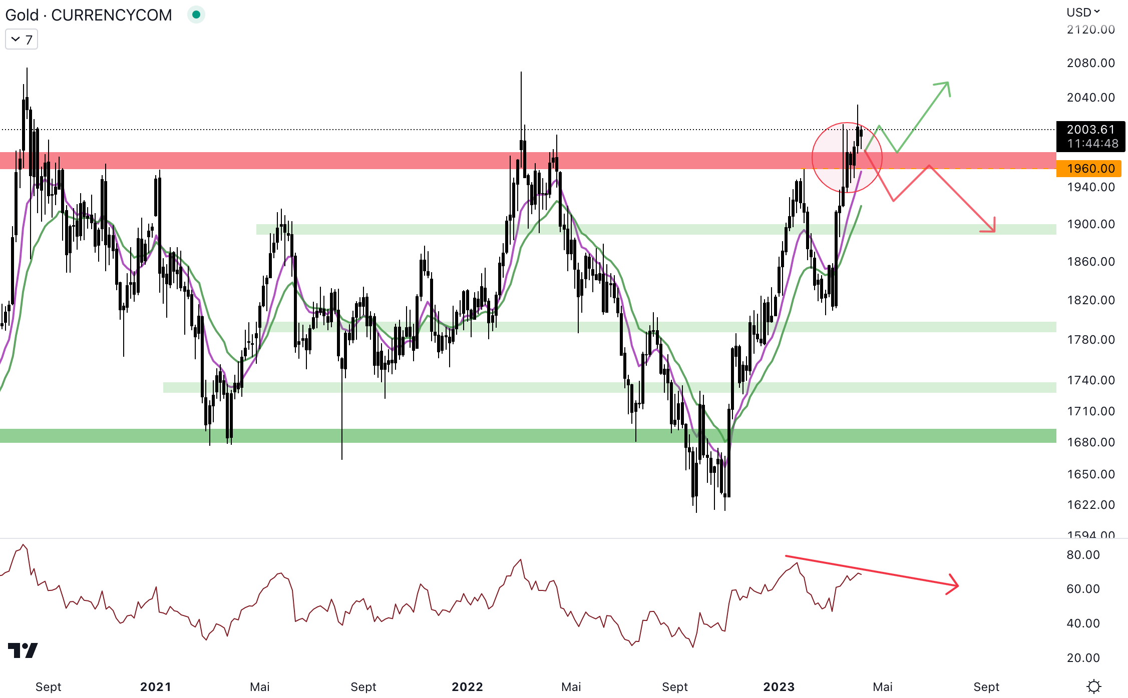 Le biais institutionnel est haussier, il pourrait agir en tant que support dynamique dans les jours à venir. Attention, en cas de rejet, le cours pourrait revenir au niveau du prochain support à 1 890 $. Les acheteurs ont la possibilité de sortir de ce range installé depuis plusieurs années, mais vont-ils y arriver ?
