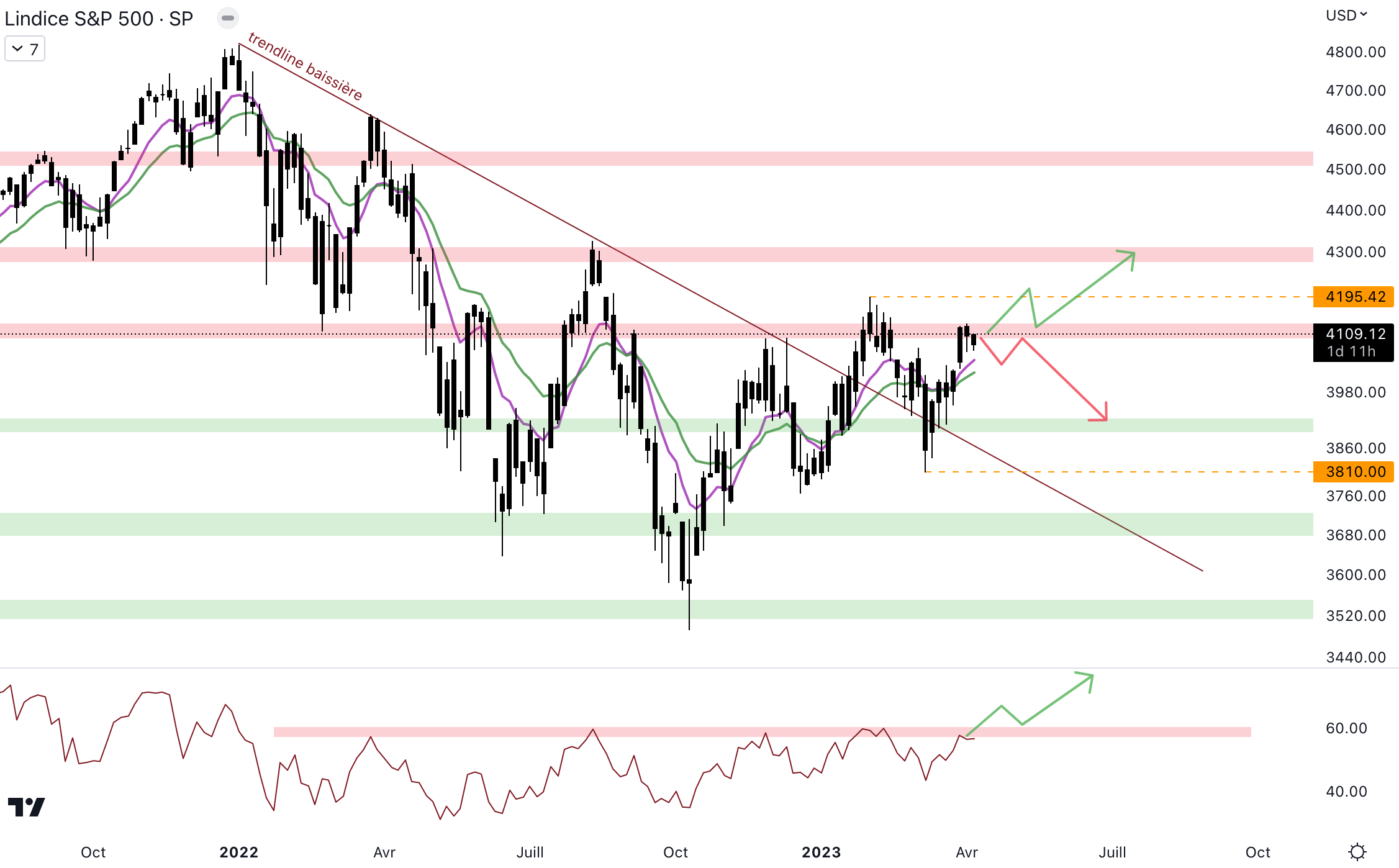 Le RSI continue d’évoluer au-dessus de la trendline haussière. Cependant, le RSI a du mal à marquer un sommet plus haut que le précédent, une potentielle divergence apparaît.