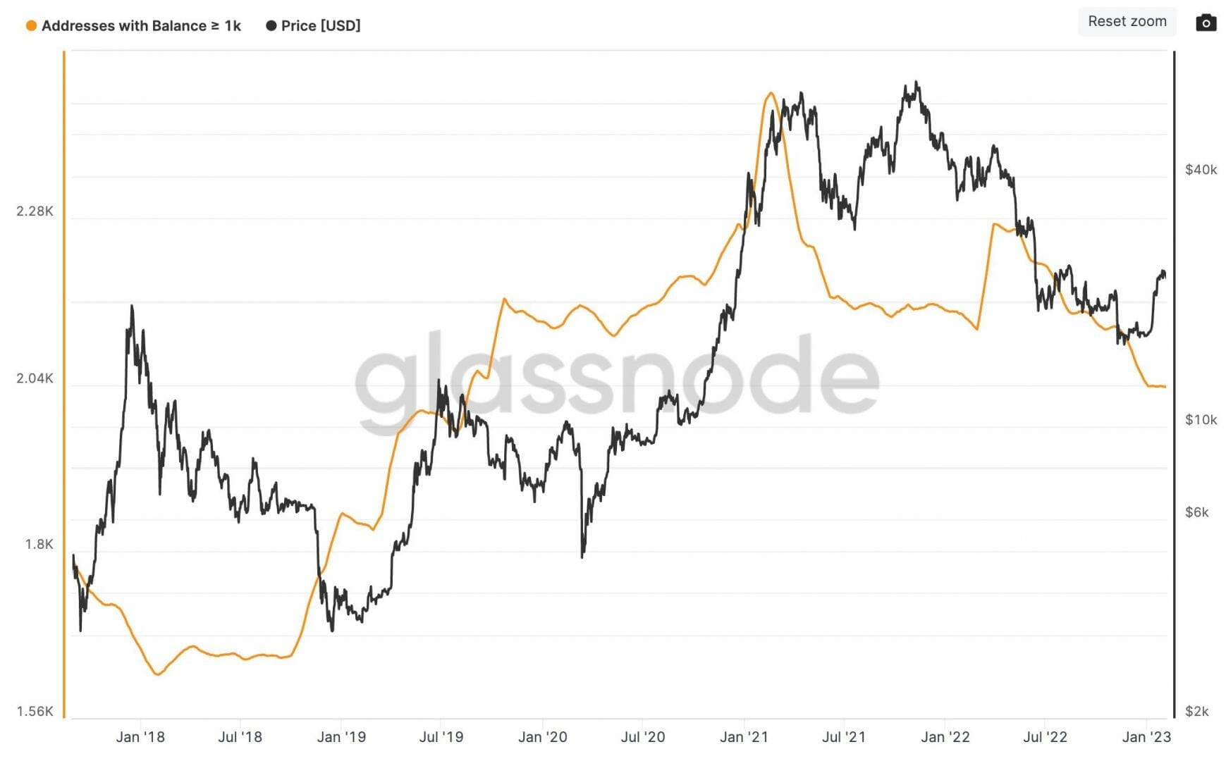 L’analyse on-chain permet d’avoir des informations concernant les portefeuilles ayant plus de 1 000 BTC aussi appelés whales. Ces entités restent sur la touche pour le moment :