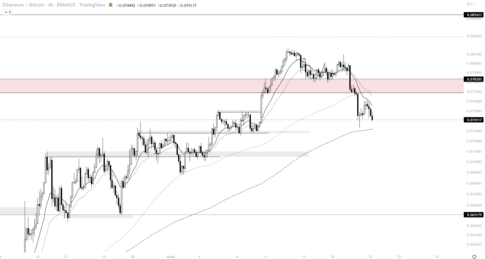 Actuellement, la dominance du bitcoin n’a rien d’incroyable. Bien au contraire, cela démontre le manque de vigueur de l’actif depuis plusieurs semaines. Marquant présentement une pause dans sa chute, il latéralise entre un support local et une résistance en confluence avec la EMA 13. En reprenant cette zone rouge, le combat pour une jambe haussière ne serait probablement pas terminé. En effet, il y aura la EMA 25 à reprendre. Celle-ci est en confluence avec le niveau horizontal que nous avons identifié depuis plusieurs semaines.